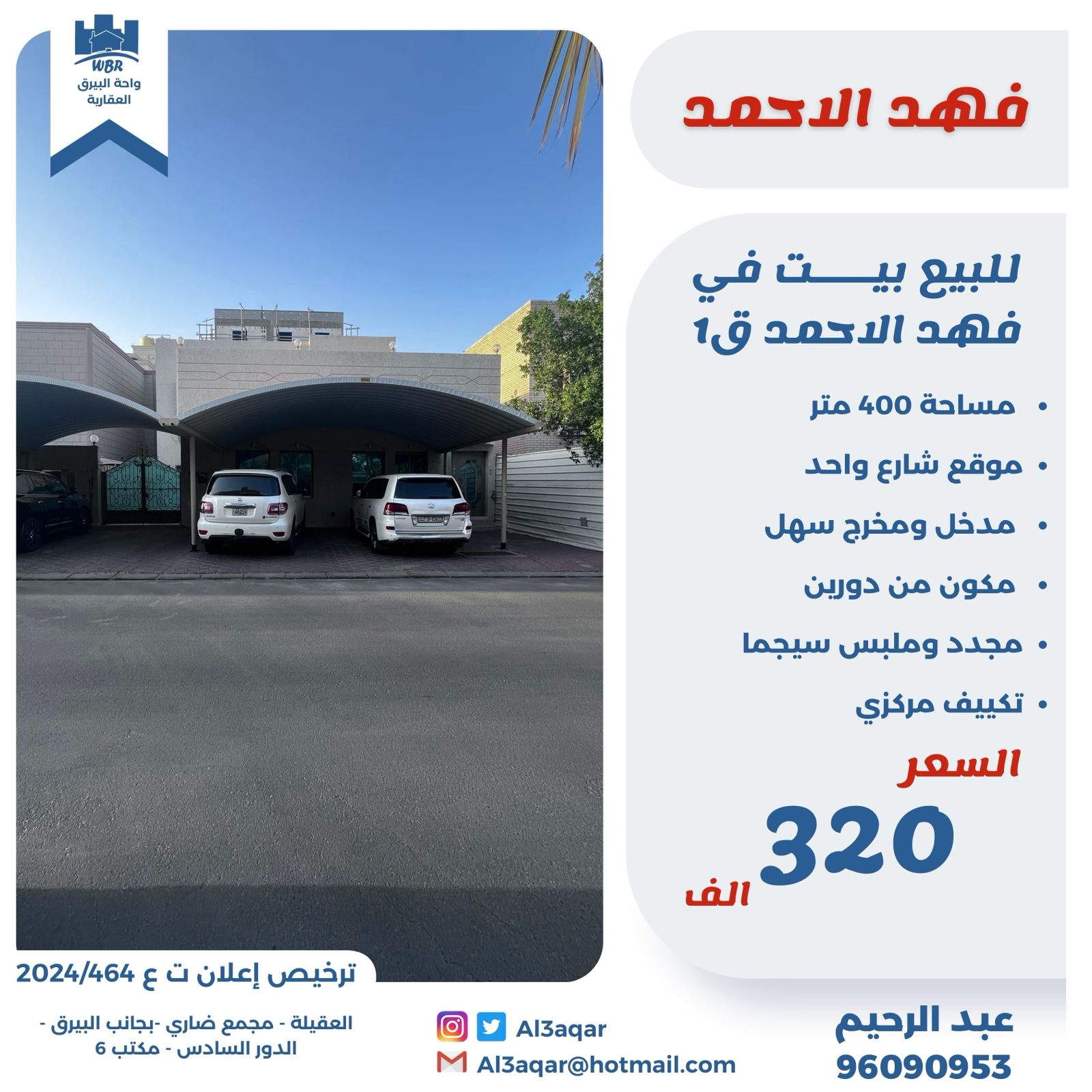بيت للبيع فى فهد الأحمد Share ملخص للبيع بيت فى فهد الاحمد قطعه1 ، مساحته 400 متر مربع ، موقع شارع واحد ، مدخل ومخرج سهل ، مكون من دورين ، مجدد وملبس سيجما ، تكييف مركزي ، السعر 320 ألف د.ك التفاصيل Page Views الأماكن القريبة من جوجل Close
