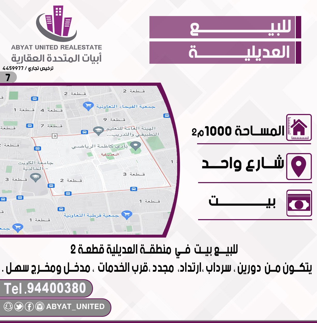 للبيع بيت في منطقه العديلية قطعة 2 , الموقع شارع واحد ، المساحة 1000 متر مربع ، يتكون من دورين ، سرداب ، مجدد ، قرب الخدمات ، مدخل ومخرج سهل ، للاستفسار النقال 1 94400380 ، كود 7