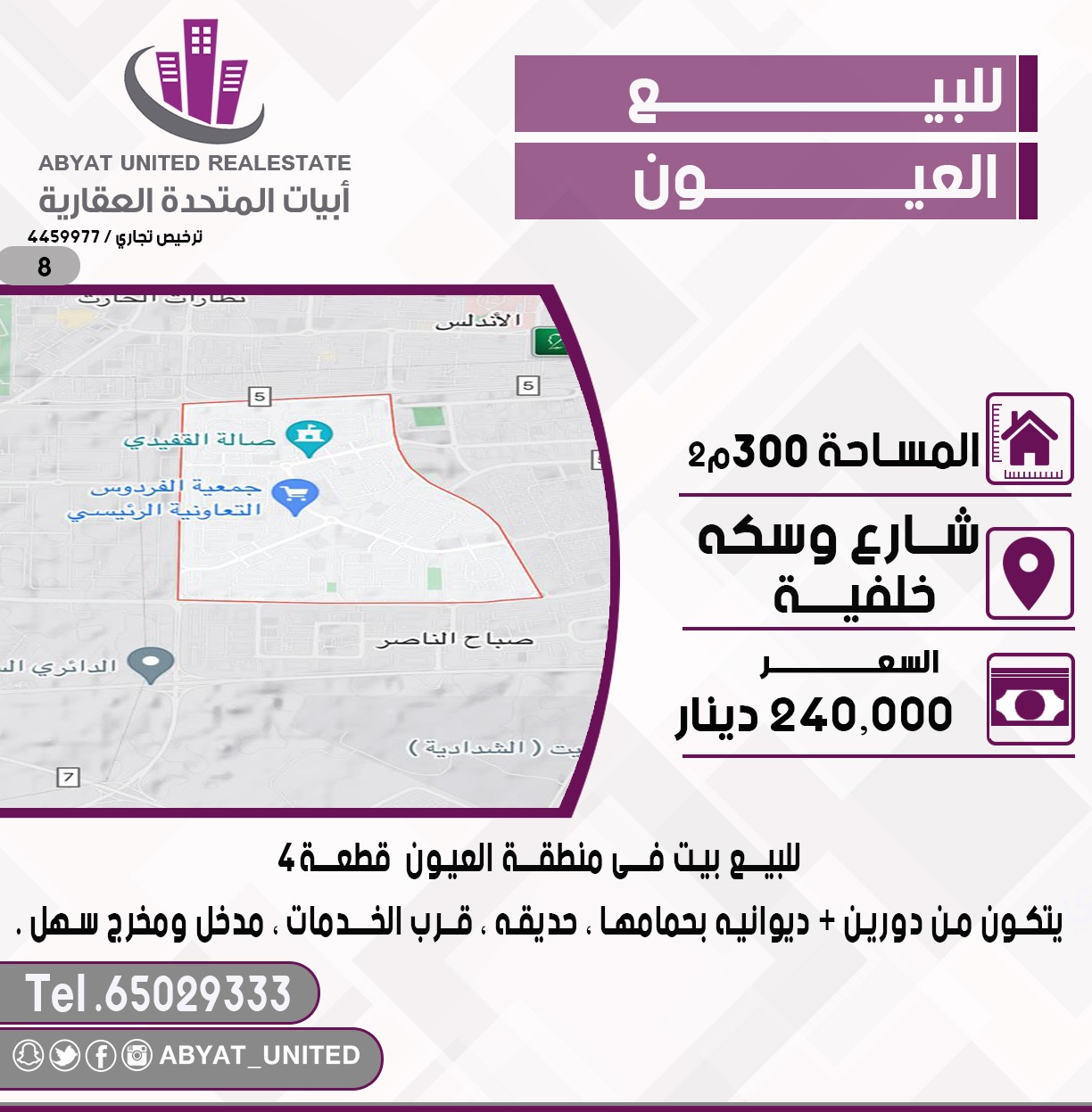 للبيع بيت في منطقه العيون قطعه 4 ، الموقع شارع وسكه خلفيه ، المساحة 300 متر مربع، يتكون من دورين ، ديوانيه بحمامها ، حديقه ، قرب الخدمات ، مدخل ومخرج سهل ، للاستفسار النقال 1 65029333 ، السعر 240 ألف دينار ، كود ، 8