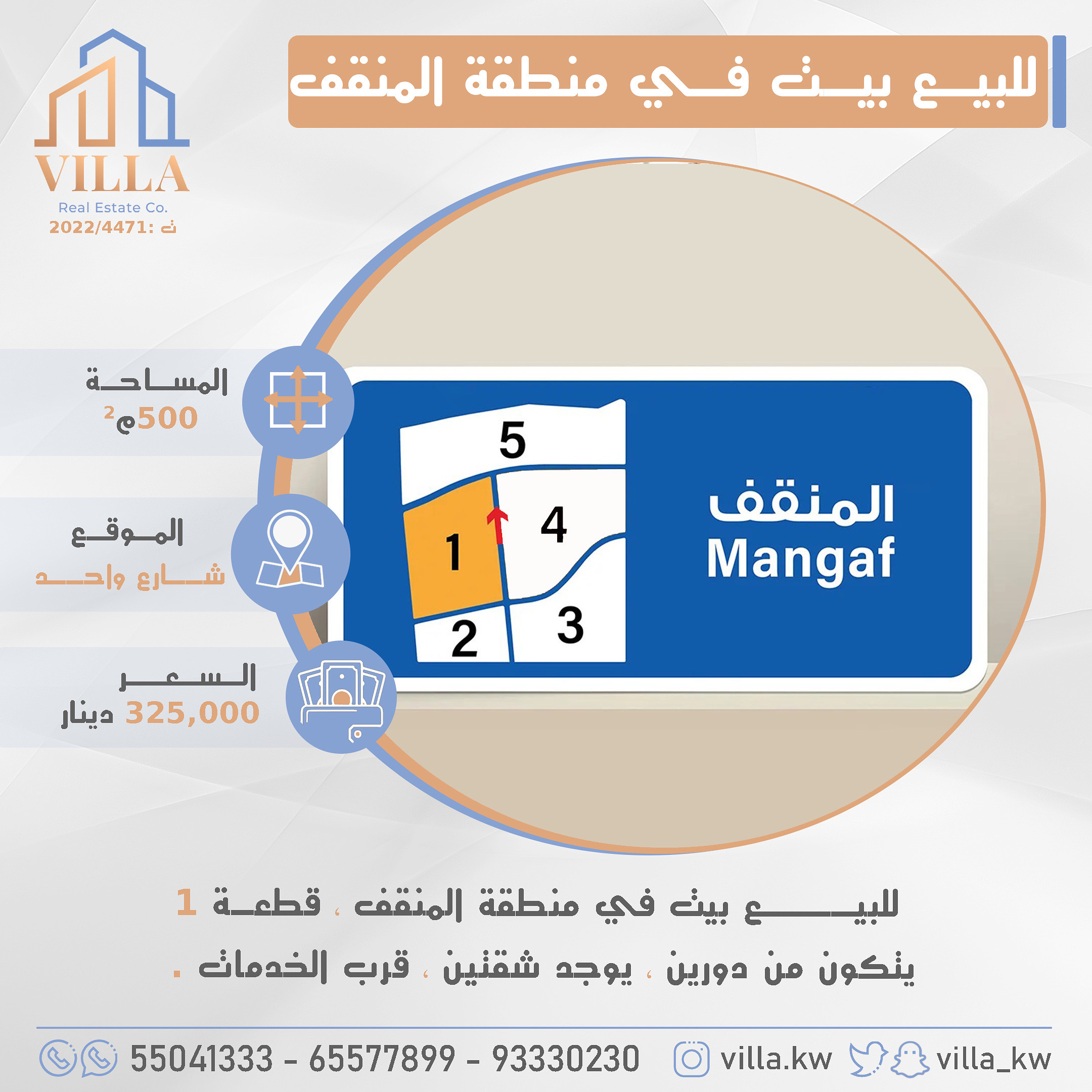 للبيع بيت في منطقة المنقف ، قطعة 1 ، المساحة 500 متر مربع ، يقع على شارع واحد ، يتكون من دورين ، يوجد شقتين ، مؤجر 1,450 د.ك شهرياً ، مدخل ومخرج سهل ، السعر 325 ألف د.ك ، ترخيص 2022 ، 4471 ، للاستفسار ، نقال 1 ، 93330230 ، نقال 2 ، 55041333 ، نقال 3 ، 65577899