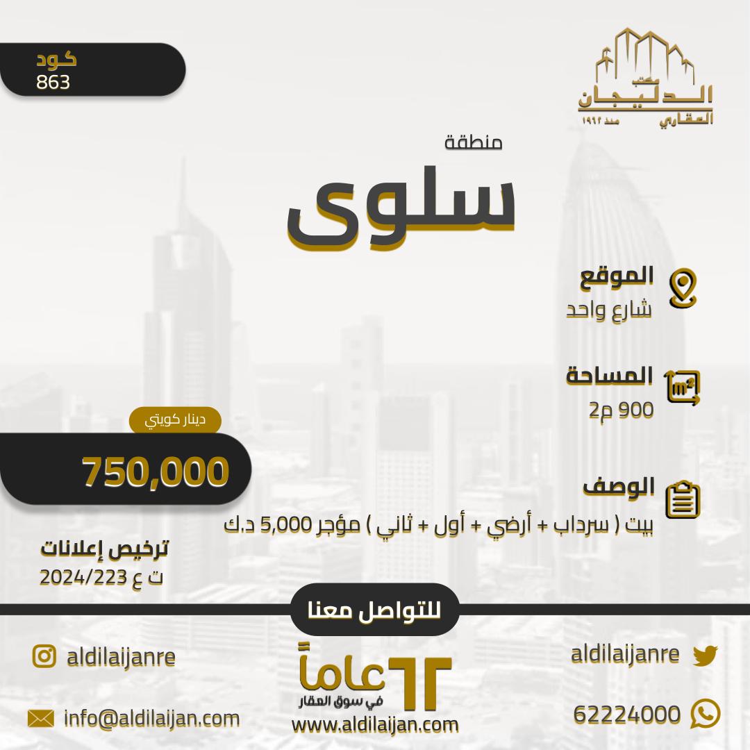 بيت للبيع فى منطقة سلوى Share ملخص بيت مساحته 900 متر مربع ، الموقع شارع واحد ، كود 863 ، مراجعة 750000 د.ك التفاصيل Page Views الأماكن القريبة من جوجل Close