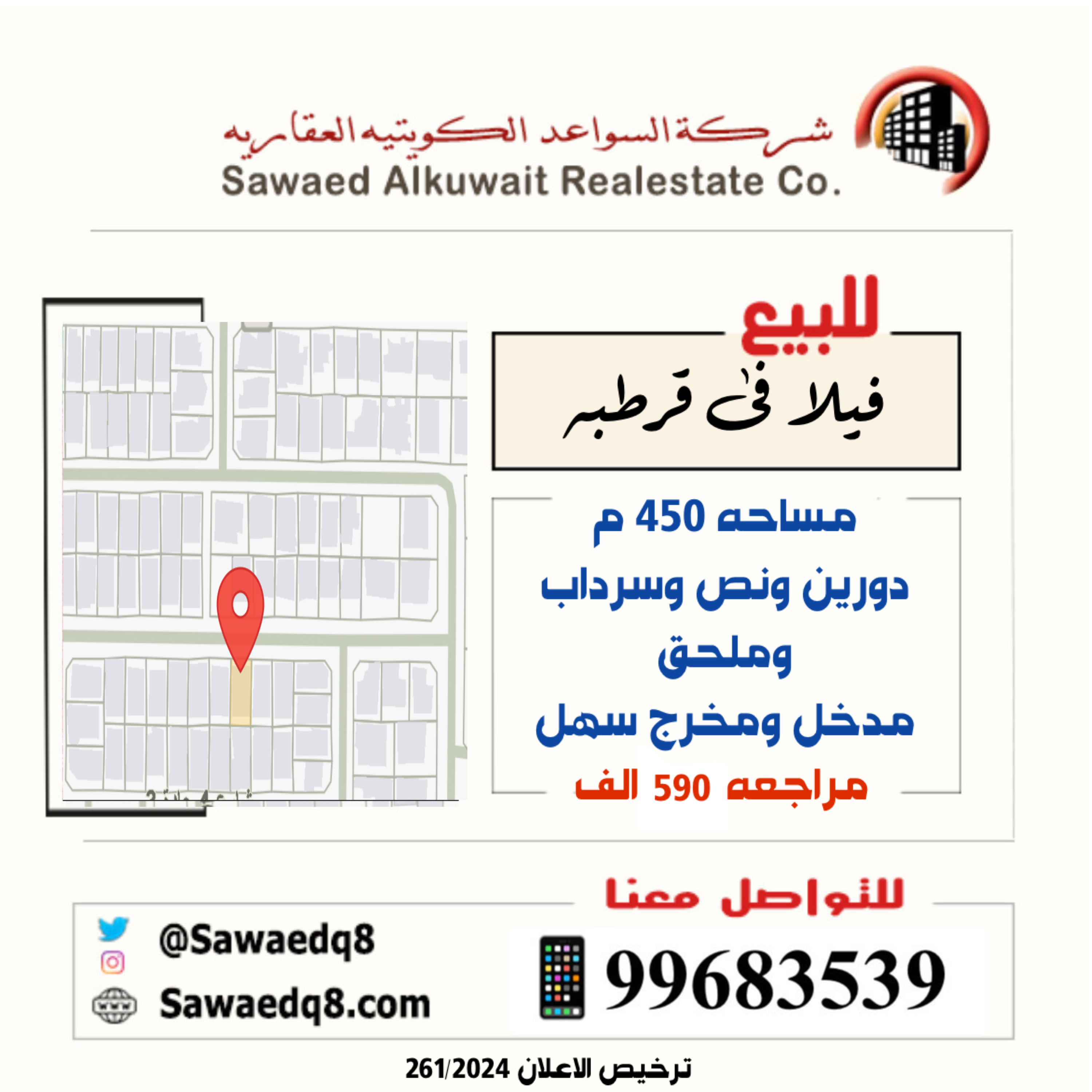 *للبيع بيت في قرطبة قطعة 2 ، يتكون من دورين ونص وسرداب وملحق ، مساحته 450 متر مربع ، يقع على شارع واحد ، السرداب صالة كبيرة ومطبخ وغرفة ماستر كبيرة وغرفة صغيرة ، الدور الارضى صالة كبيرة وحمام ضيوف ومطبخ فيه باب خارجي للحوش فيه غرفتين كل غرفه معاها حمام ، الدور الاول عباره عن صالة ومطبخ وغرفه كبيرة ماستر وغرفتين بينهم حمام ، ملحق غرفتين ومطبخ وبابين خارجي ، السطح غرفة للخدامة مع حمام وغرفة غسيل ، مراجعه 590 ألف د.ك ، وثيقه حره