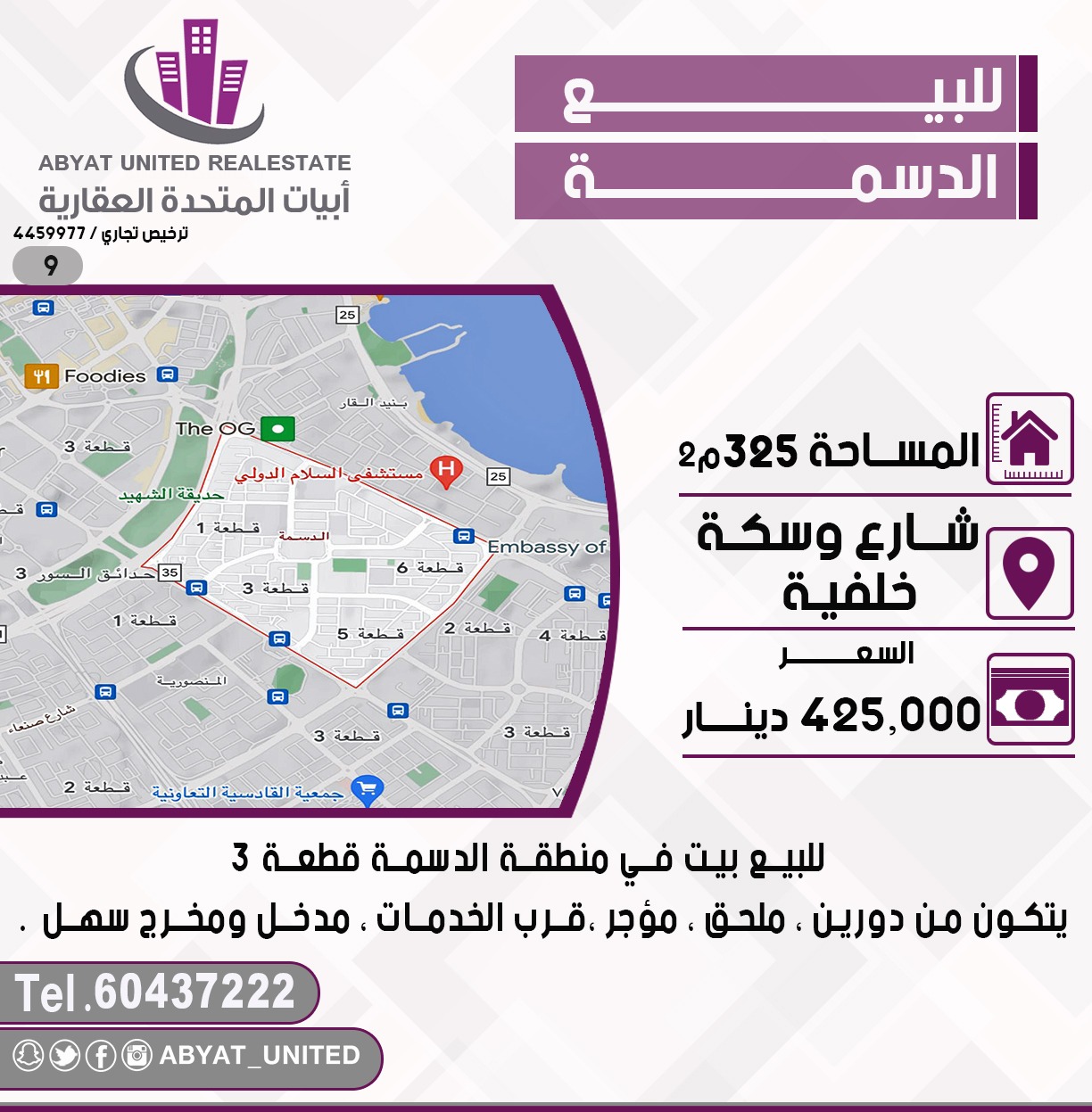 بيت للبيع في الدسمه قطعه 3 Share ملخص للبيع بيت في منطقة الدسمة قطعة 3 , الموقع شارع وسكة خلفية ، مساحته 325 متر مربع ، يتكون من دورين ، ملحق ، مؤجر ، قرب الخدمات ، مدخل ومخرج سهل . للاستفسار النقال 1 60437222 ، السعر 425 ألف دينار التفاصيل حالة: للبيع Page Views الأماكن القريبة من جوجل خصائص ذات صلة للبيع تجربة عنصر للبيع abdulrahman منذ أسبوعين للبيع د.ك111111 شقة تجربة عقار جديد خليل بوست أسرة: 666666 الحمامات: 666666 admin منذ 4 أسابيع Close