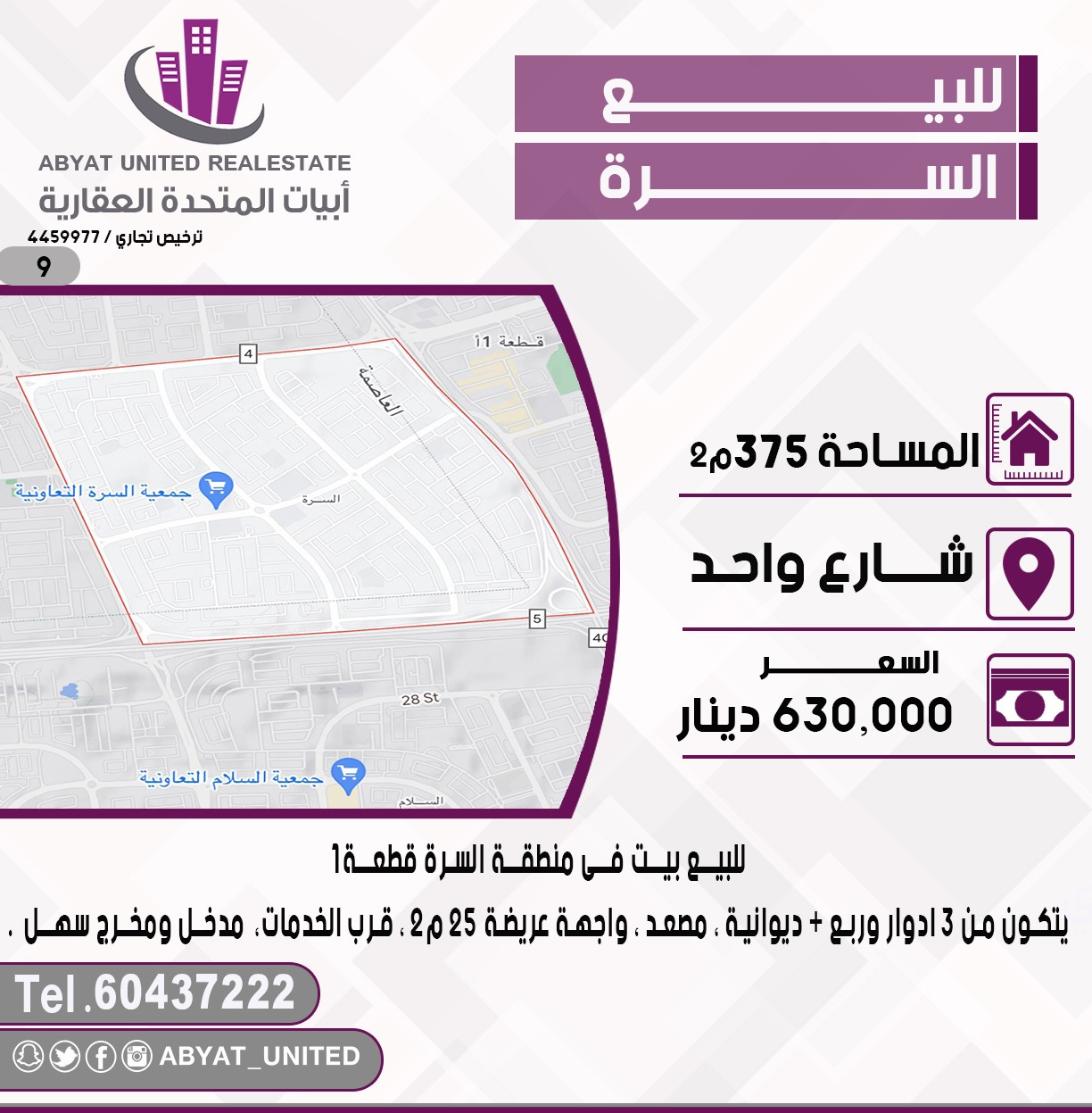 للبيع بيت في منطقة السرة قطعة 1 , الموقع شارع واحد ، مساحته 375 متر مربع ، يتكون من 3 أدوار وربع ، ديوانية ، مصعد ، واجهة عريضة 25 متر ، قرب الخدمات ، مدخل ومخرج سهل . للاستفسار النقال 1 60437222 ، السعر 630 ألف دينار كويتى
