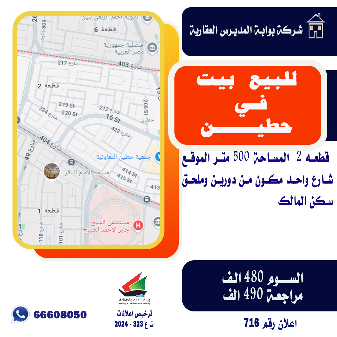 للبيع بيت في حطين قطعه 2 ، المساحة 500 متر مربع ، الموقع شارع واحد ، مكون من دورين وملحق ، سكن المالك ، السوم 480 ألف د.ك ، مراجعة 490 ألف د.ك يمنع الوسطاء شركة بوابة المديرس العقارية ، اعلان رقم 716 ترخيص وزارة التجارة لنشر الإعلان ت ع 323 ، 2024
