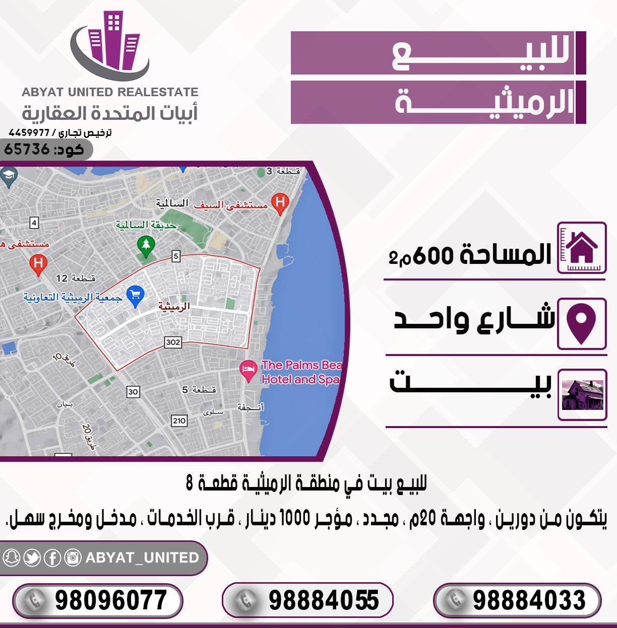 للبيع بيت فى منطقه الرميثيه , قطعه 8 , الموقع شارع واحد ، المساحة 600 متر مربع ، يتكون دورين ، واجهة 20 متر ، مجدد ، مؤجر 1000 دينار ، قرب الخدمات ، مدخل ومخرج سهل .