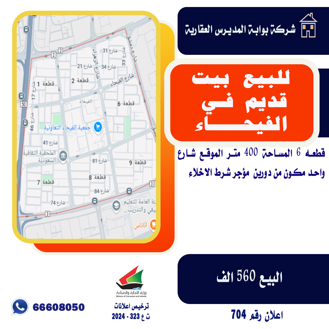 بيت مؤجر للبيع فى الفيحاء Share ملخص للبيع بيت قديم في الفيحاء ، قطعه 6 ، المساحة 400 متر مربع ، الموقع شارع واحد ، مكون من دورين ، مؤجر شرط الاخلاء السعر 560 ألف د.ك شركة بوابة المديرس العقارية اعلان رقم 704 التفاصيل حالة: للبيع Page Views الأماكن القريبة من جوجل خصائص ذات صلة للبيع تجربة عنصر للبيع abdulrahman منذ أسبوعين للبيع د.ك111111 شقة تجربة عقار جديد خليل بوست أسرة: 666666 الحمامات: 666666 admin منذ 4 أسابيع Close
