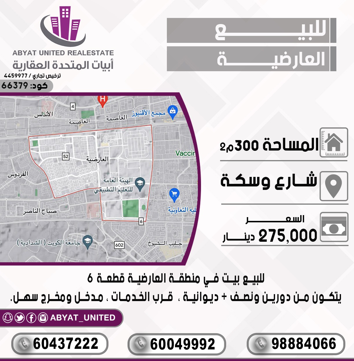 للبيع بيت في منطقة العارضية ، قطعه 6 ، يقع على شارع وسكه ، مساحته 300 متر مربع ، يتكون من دورين ونصف ، وديوانية ، قريب من الخدمات ، مدخل ومخرج سهل ، للاستفسار ، النقال 1 ، 60437222 ، النقال 2 ، 60049992 ، النقال 3 ، 98884066 ، السعر 275 الف د.ك ، الكود 66379