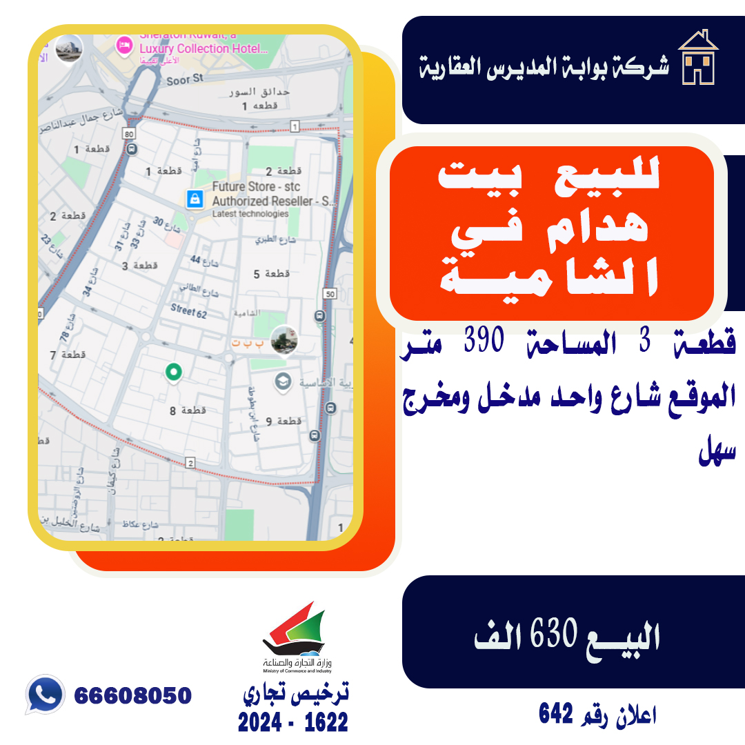 بيت هدام للبيع فى الشامية Share ملخص للبيع بيت هدام في الشامية ، قطعة 3 المساحة 390 متر مربع ، الموقع شارع واحد ، مدخل ومخرج سهل ، السعر 630 ألف د.ك يمنع الوسطاء شركة بوابة المديرس العقارية اعلان رقم 642 التفاصيل Page Views الأماكن القريبة من جوجل Close