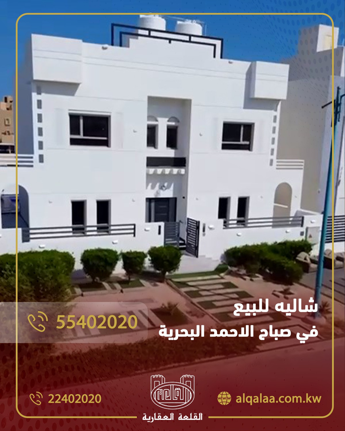 شاليه للبيع فى صباح الاحمد البحرية ، مساحته 410 متر مربع , يتكون من دورين , مصعد و ارتداد كبير مفتوح 100متر الشاليه جديد , صف ثاني ، السعر 310 ألف دينار