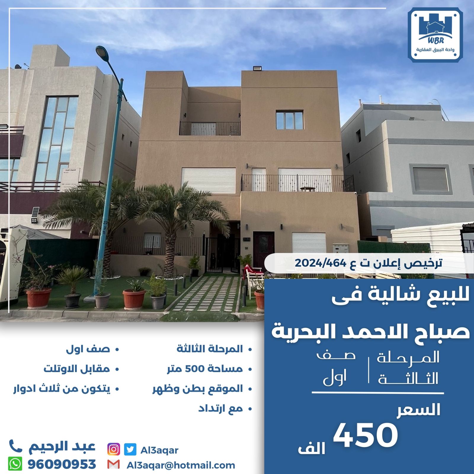 للبيع شالية فى صباح الاحمد البحرية بالمرحلة الثالثة موقع صف أول مساحته 500 متر مربع ، مقابل الاوتلن يتكون من ثلاث أدوار مع ارتداد مع يقع على بطن وضهر السعر 450 ألف د.ك.