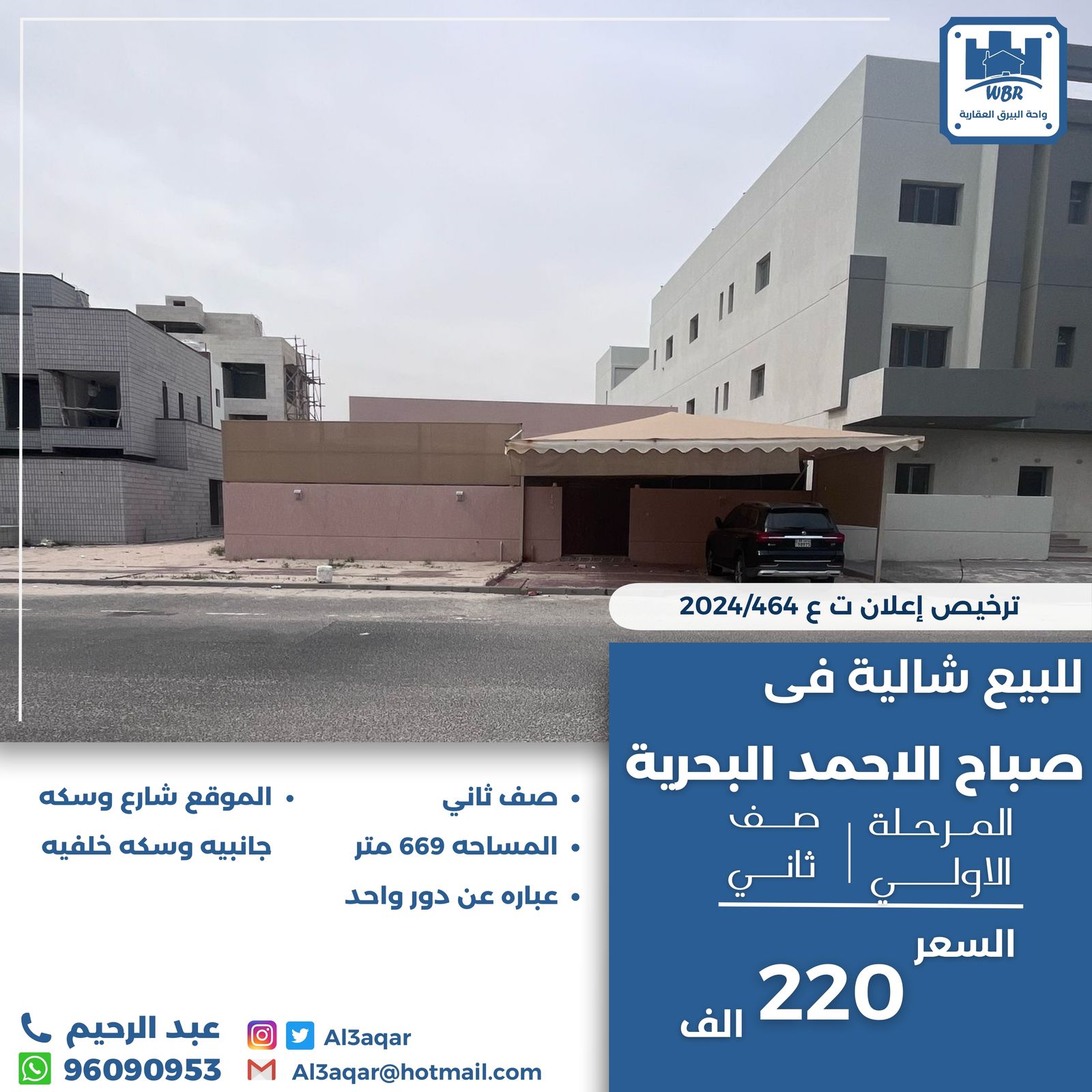 للبيع شاليه في صباح الاحمد البحريه المرحله الاولى ، صف ثاني ، مساحته 669 متر مربع ، عباره عن دور واحد ، الموقع شارع وسكه جانبيه وسكه خلفيه ، السعر 220 ألف د.ك