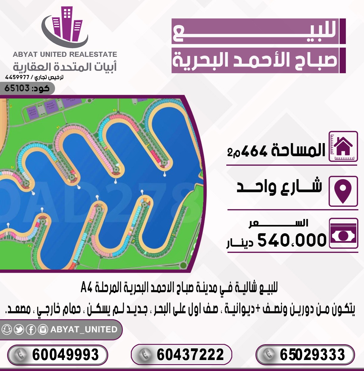 للبيع شالية في مدينة صباح الاحمد البحرية المرحلة A4 ، الموقع شارع واحد ، المساحة 464 متر مربع ، يتكون من دورين ونصف ، ديوانية ، صف اول على البحر ، جديد لم يسكن ، حمام خارجي ، مصعد . للاستفسار النقال 1 60437222 ، النقال 2 60049993 ، النقال 3 65029333 ، السعر 540 ألف دينار ، الكود 65103