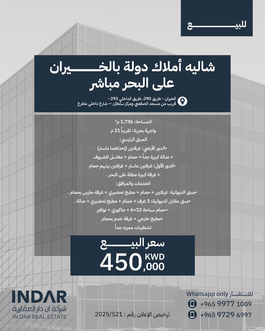 شالية أملاك دولة بالخيران على البحر مباشر الخيران طريق 290 ، طريق داخلي 293 قريب من مسجد الصقعبي ومركز سلطان ، مساحته 1736 متر مربع ، واجهة بحرية تقريبا 21 متر ، المبنى الرئيسي .
