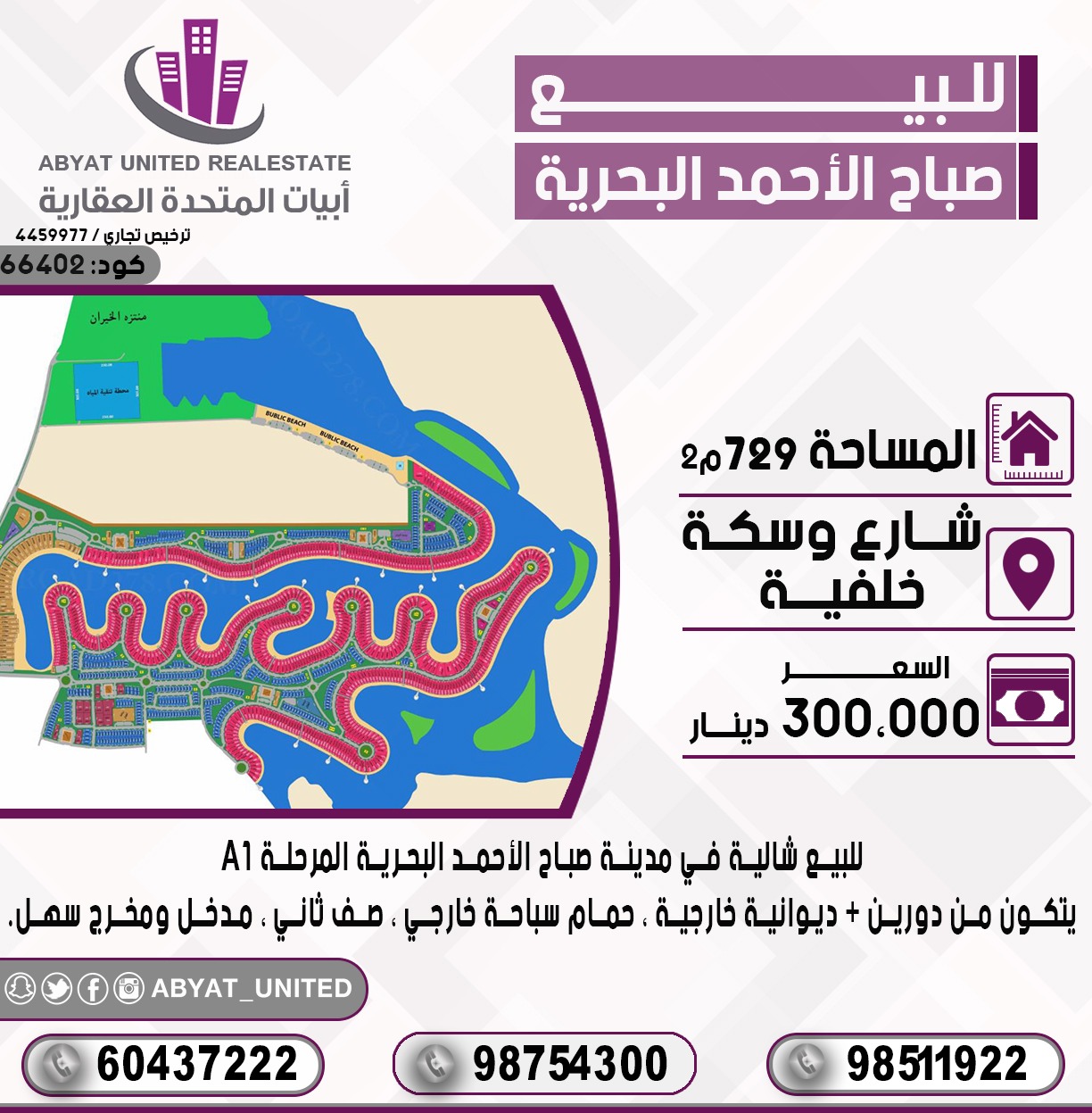 للبيع شاليه في مدينة صباح الاحمد البحرية ، المرحلة a1 ، يقع على شارع وسكة خلفية ، مساحته 729 متر مربع ، يتكون من دورين ، ديوانية خارجية ، حمام سباحة خارجي ، صف ثاني ، مدخل ومخرج سهل ، للاستفسار ، النقال 1 ، 60437222 ، النقال 2 ، 98754300 ، النقال 3 ، 98511922 ، السعر 300 الف د.ك ، الكود 66402