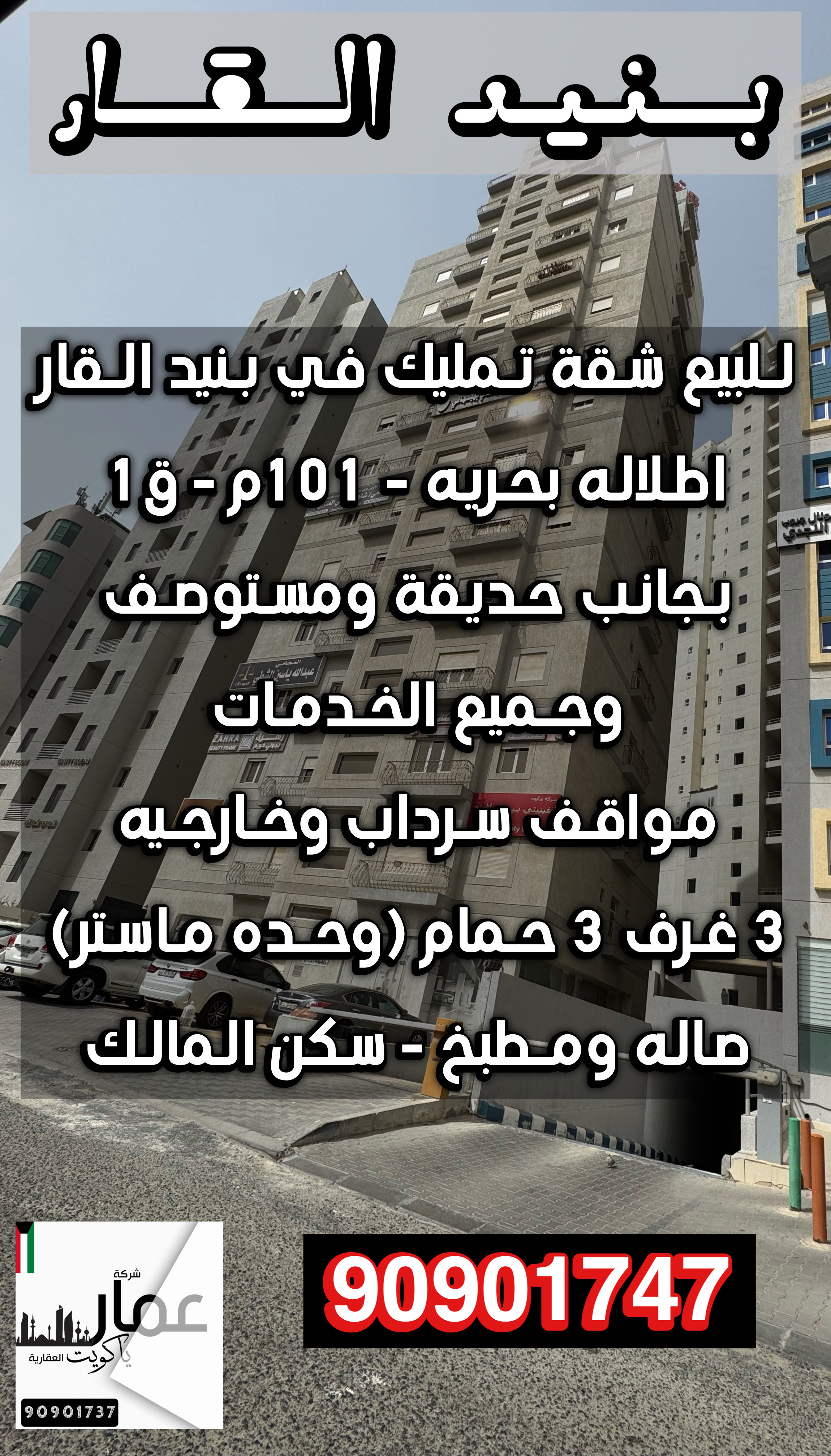 للبيع شقة تمليك فى بنيد القار ، مساحتها 101 متر مربع قطعة 1 ، اطلاله بحريه بجانب حديقة ومستوصف وجميع الخدمات و مواقف سرداب وخارجيه و 3 غرف و 3 حمام وحده ماستر و صاله ومطبخ ، سكن المالك .