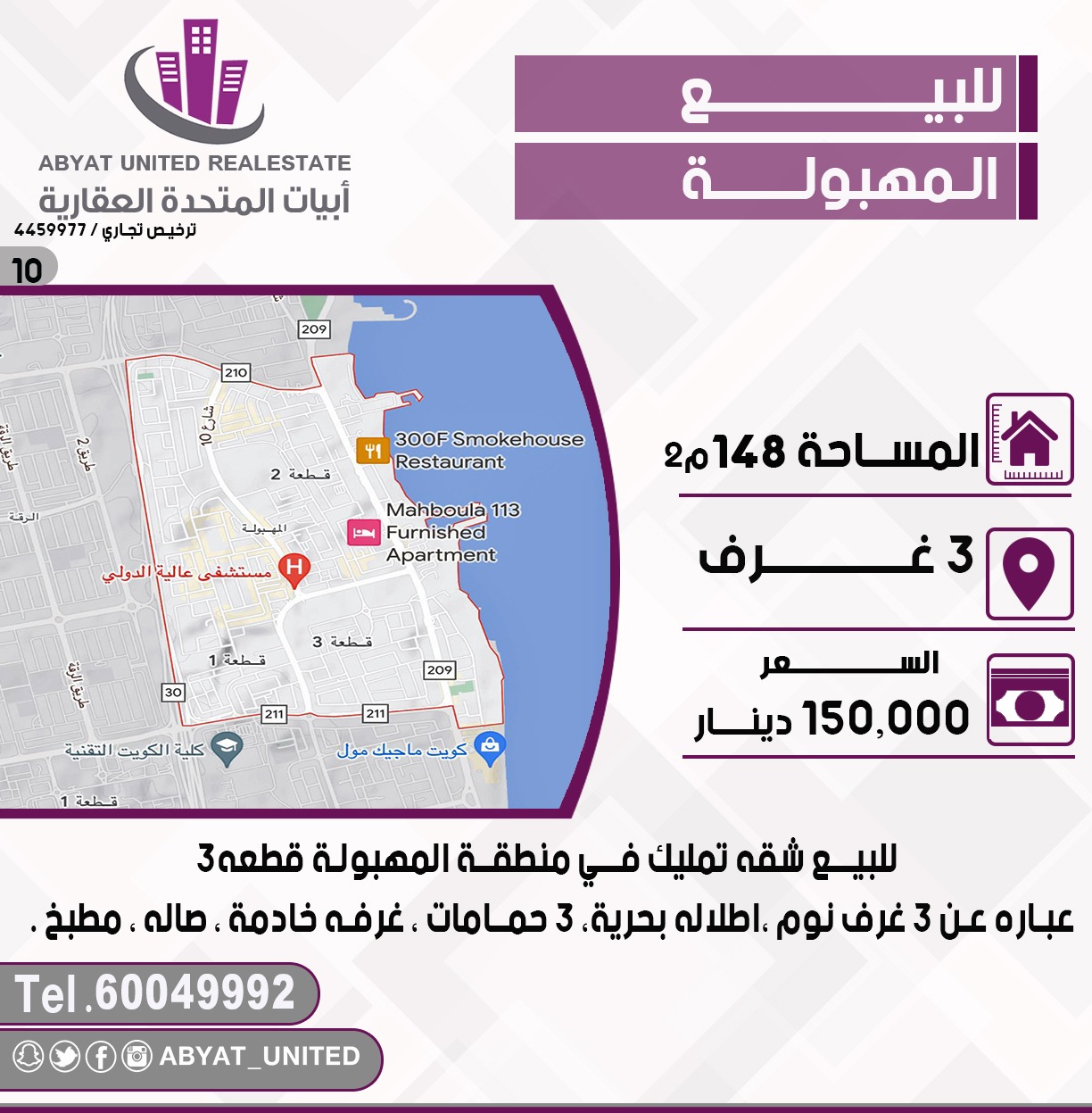 للبيع شقة تمليك في منطقة المهبوله ، قطعة 3 ، مساحتها 148متر مربع ، تتكون من 3 غرف نوم ، إطلالة بحرية ، 3 حمامات ، غرفه خادمة ، صالة ، مطبخ ، للاستفسار ، النقال 1 ، 60049992 ، السعر 150 ألف د.ك ، كود 10