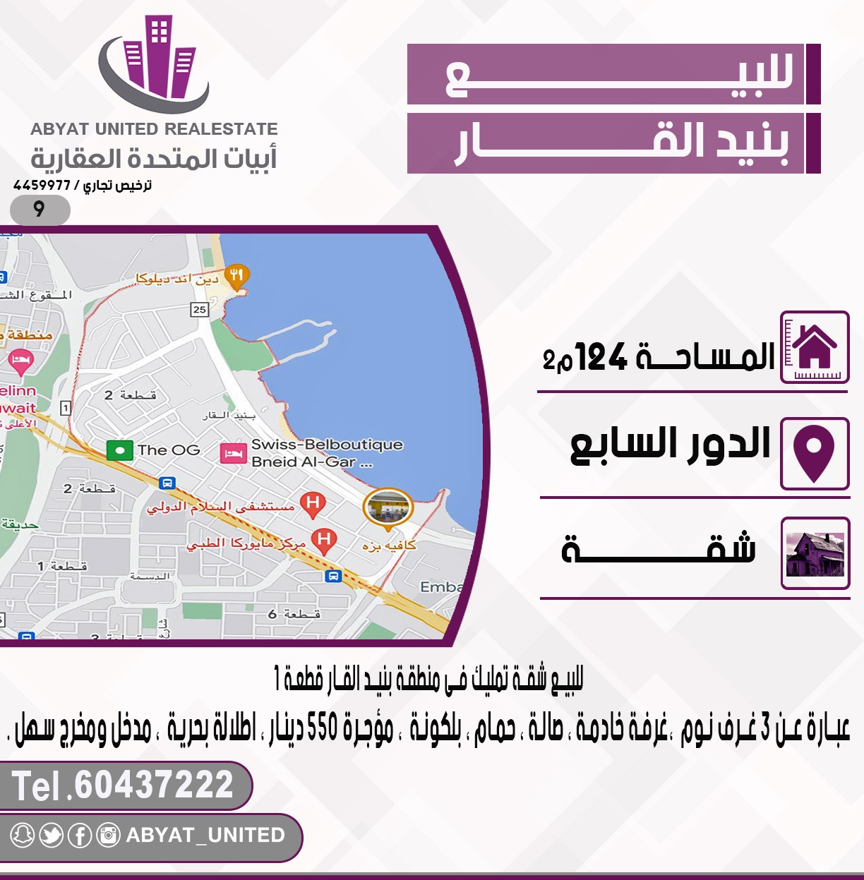 للبيع شقة في منطقة بنيد القار , الدور السابع ، المساحة 124 متر مربع ، عبارة عن 3 غرف نوم ، غرفة خادمة ، صالة ، حمام ، بلكونه، مؤجرة 550 دينار كويتي ، اطلالة بحرية ، مدخل ومخرج سهل ، للاستفسار ، النقال 1 ، 60437222
