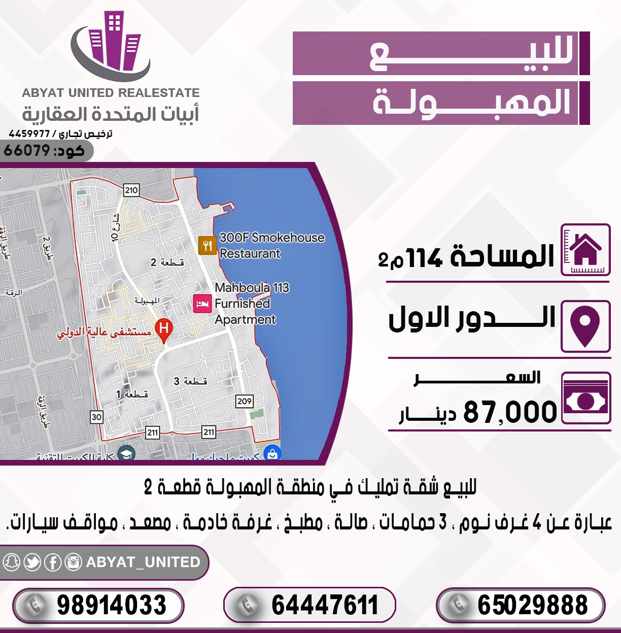 للبيع شقة تمليك في منطقة المهبوله ، قطعه 2 الدور الاول ، المساحة 114 متر مربع ، عباره عن 4 غرف نوم ، 3 حمامات ، صاله ، مطبخ ، غرفة خادمة ، مصعد ، مواقف سيارات .