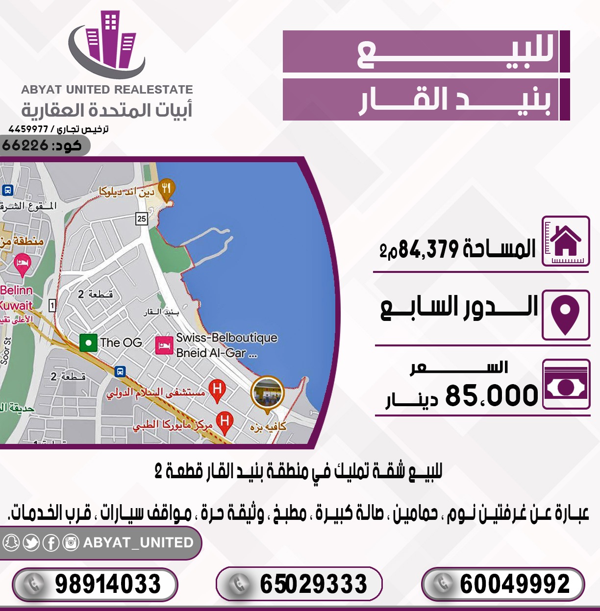 للبيع شقه تمليك في منطقه بنيد القار قطعه 2 ، الدور السابع ، المساحة 84.379 متر مربع ، عباره عن غرفتين نوم ، حماممين ، صاله كبيره ، مطبخ ، وثيقه حرة ، مواقف سيارات ، قرب الخدمات .