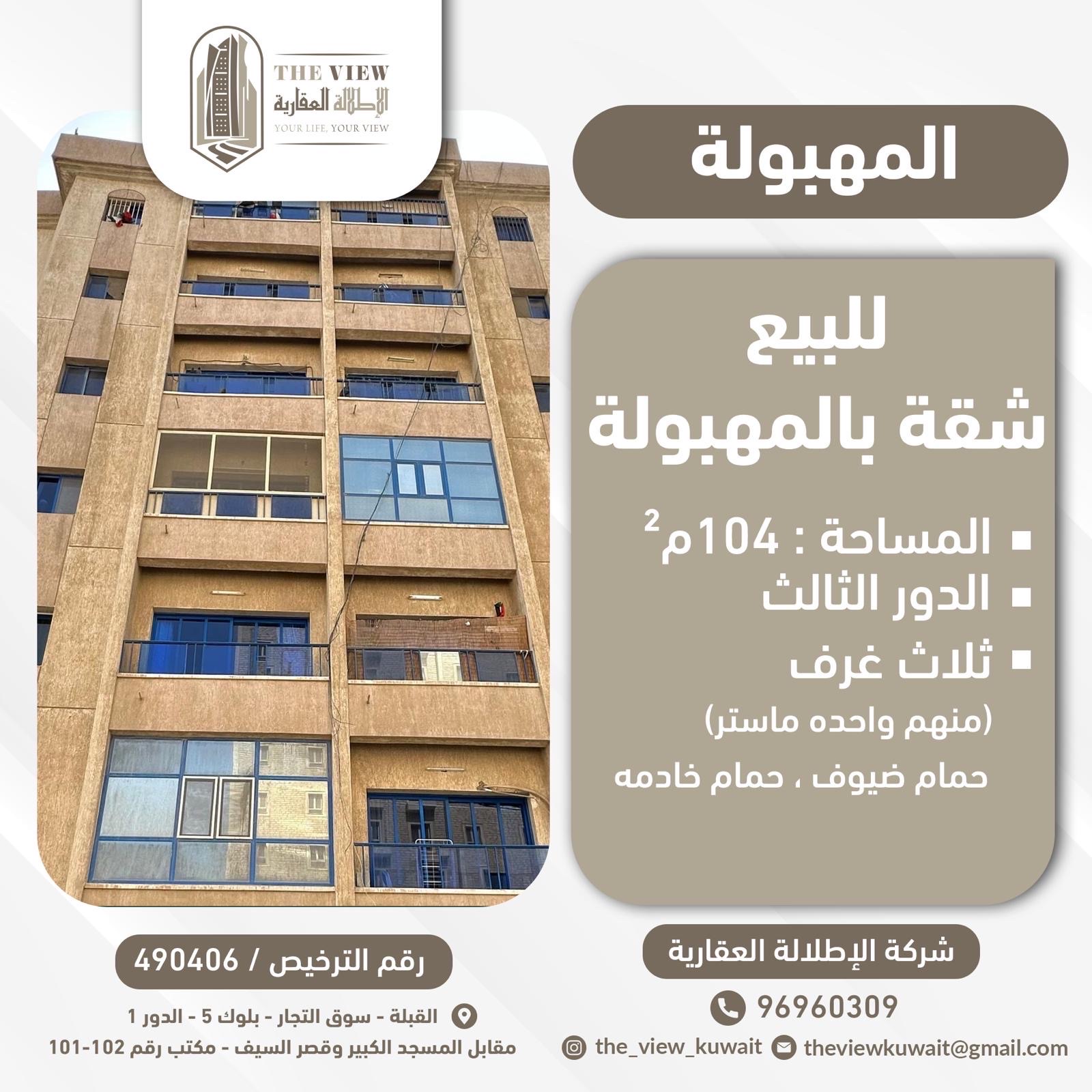 شقه ثلاث غرف للبيع فى المهبوله Share ملخص للبيع شقه فى المهبوله ، مساحتها 104 متر مربع ، الدور الثالث ، تتكون من ثلاث غرف ، منهم واحده ماستر حمام ضيوف ، حمام خادمه رقم ترخيص 490406 ، شركه الاطلاله العقاريه للتواصل 55683559 ، مهندس محمد التفاصيل حالة: للبيع Page Views الأماكن القريبة من جوجل خصائص ذات صلة للبيع تجربة عنصر للبيع abdulrahman منذ 4 أسابيع للبيع للبيع أرض فى الفنيطيس قطعة 2 admin منذ شهرين Close