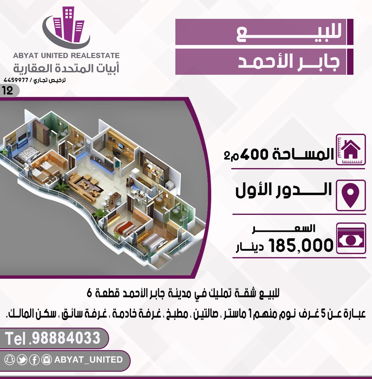 للبيع شقة تمليك في مدينة جابر الاحمد قطعة 6 ، الدور الاول ، المساحة 400 متر مربع ، عبارة عن 5 غرف نوم منهم 1 ماستر ، صالتين ، مطبخ ، غرفة خادمة ، غرفة سائق ، سكن المالك . للاستفسار النقال 1 98884033 ، السعر 185 ألف دينار