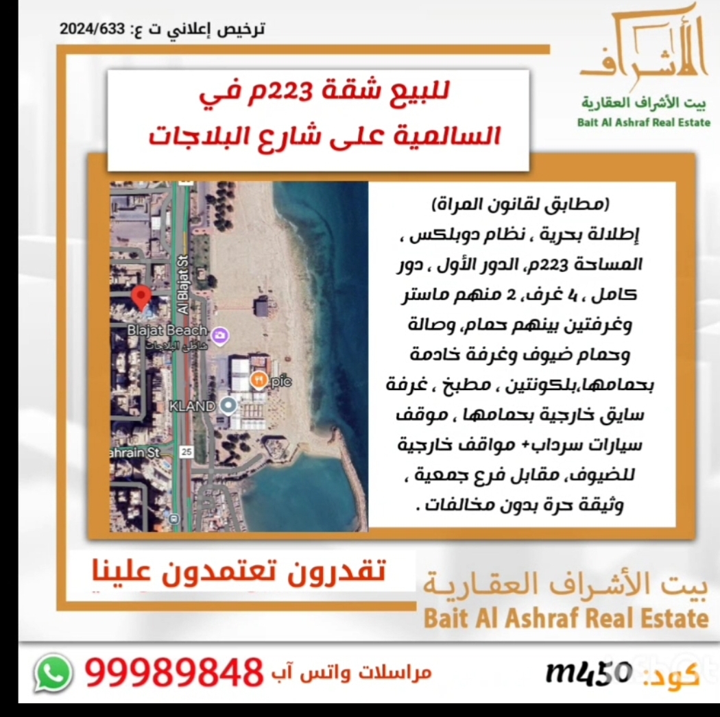 شقه للبيع فى السالميه ، مطابقه لقرض قانون المراه ، اطلاله بحريه ، مساحتها 223 متر مربع ، تقع على شارع البلاجات ، نظام دوبلكس ، الدور الاول ، دور كامل ، بها اربع