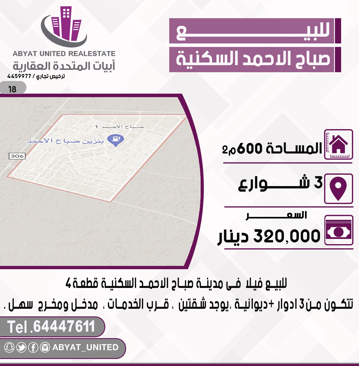 للبيع فيلا في مدينة صباح الاحمد السكنية قطعة 4 ، الموقع 3 شوارع ، المساحة 600 متر مربع ، تتكون من 3 ادوار ، ديوانية ، يوجد شقق ، قرب الخدمات ، مدخل ومخرج سهل . للاستفسار ، النقال 1 64447611 ، السعر 320 ألف دينار