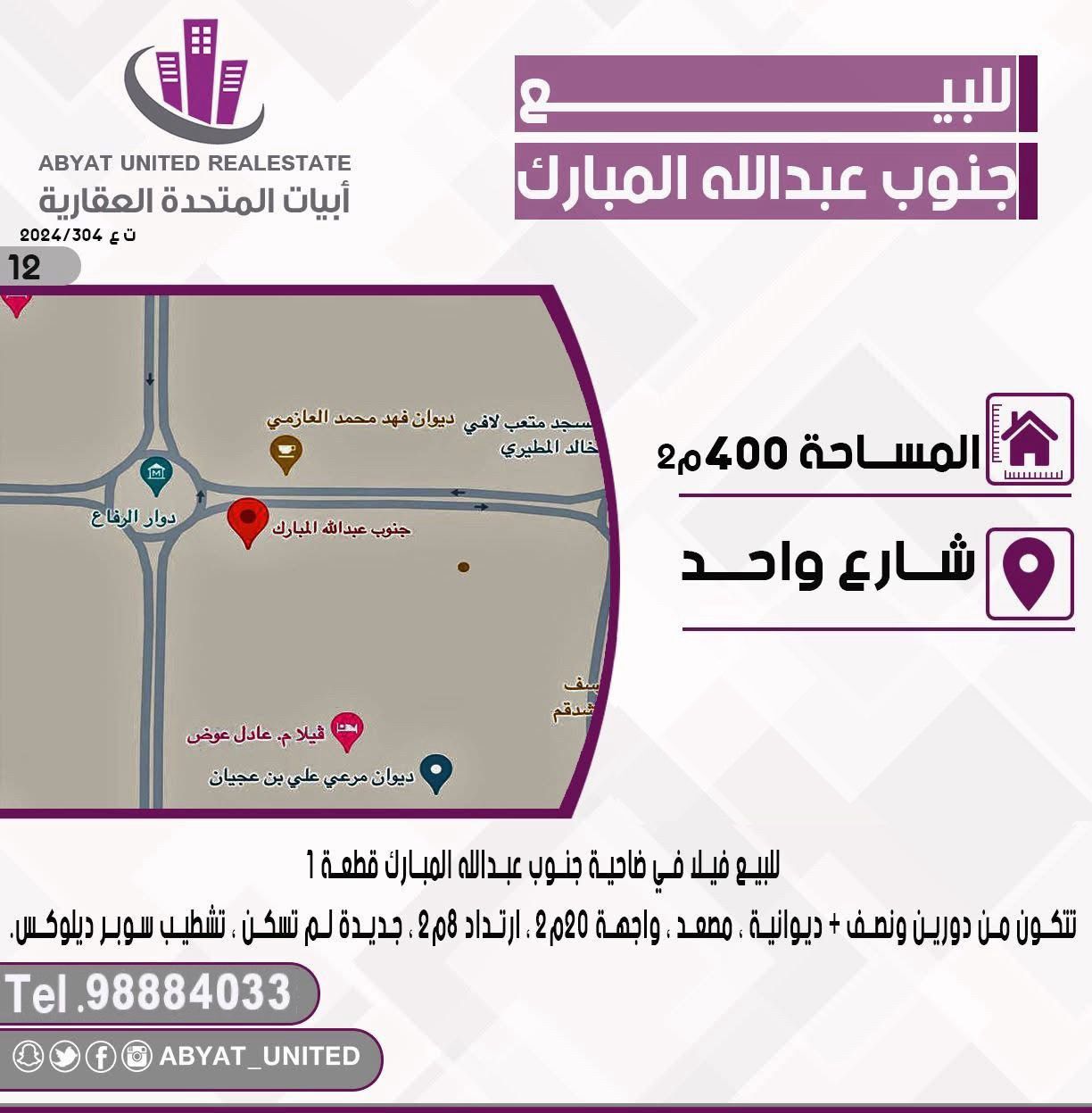 للبيع فيلا في ضاحية جنوب عبدالله المبارك قطعة1 ، الموقع شارع واحد ، المساحة 400 متر مربع ، تتكون من دورين ، ديوانية ، مصعد ، واجهة 20 متر ، ارتداد 8 متر ، جديده لم تسكن ، تشطيب سوبر ديلوكس . للاستفسار :
