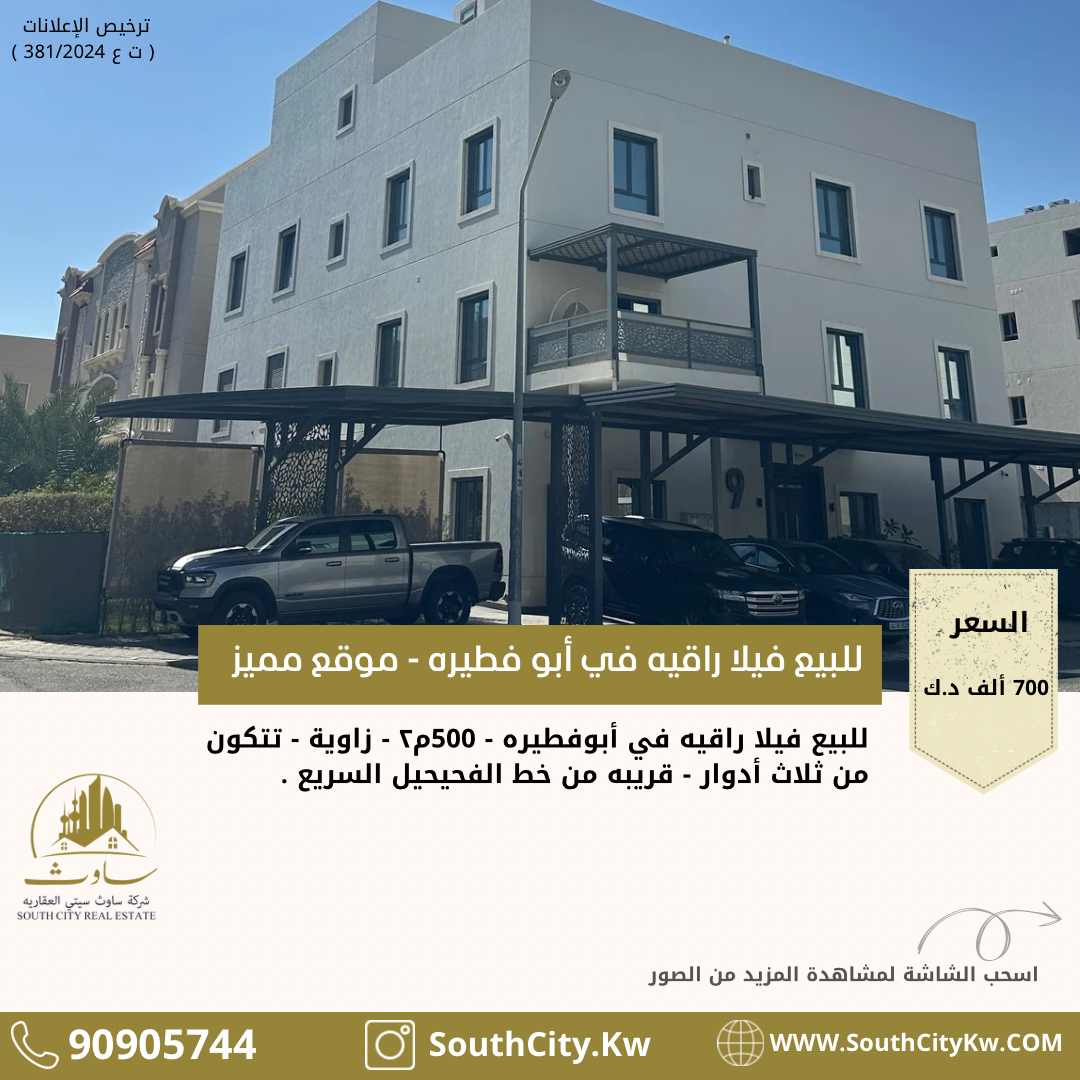 للبيع فيلا راقيه في أبوفطيره ، تقع على زاويه داخليه مع ارتداد بجانب خط الفحيحيل السريع ، مساحتها 500 متر مربع ، تتكون من ثلاث أدوار ، واجهة البيت 20 فى 25 متر مربع مع ارتداد جانبى ، السعر 700 الف دك. ت ع 2024 ، 381
