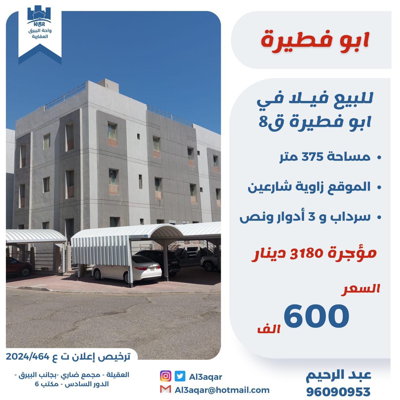 فيلا زاوية للبيع فى ابوفطيرة قطعة 8 Share ملخص للبيع فيلا فى ابوفطيرة قطعة 8 ، مساحتها 375 متر مربع ، تقع على زاوية شارعين ، تتكون من سرداب و 3 أدوار ونص ، مؤجرة بسعر 3180 دينار د.ك ، سعر البيع 600 ألف د.ك . التفاصيل حالة: للبيع Page Views الأماكن القريبة من جوجل خصائص ذات صلة للبيع تجربة عنصر للبيع abdulrahman منذ 3 أسابيع للبيع د.ك111111 شقة تجربة عقار جديد خليل بوست أسرة: 666666 الحمامات: 666666 admin منذ 4 أسابيع Close
