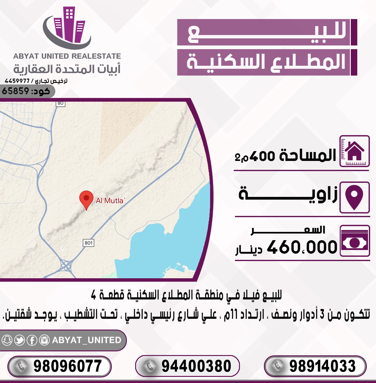 للبيع فيلا فى منطقة المطلاع السكنية ، قطعه 4 ، المساحة 400 متر مربع ، الموقع زاوية ، تتكون من 3 ادوار ونصف ، ارتداد 11 متر ، على شارع رئيسي داخلي ، تحت التشطيب ، يوجد شقتين ،