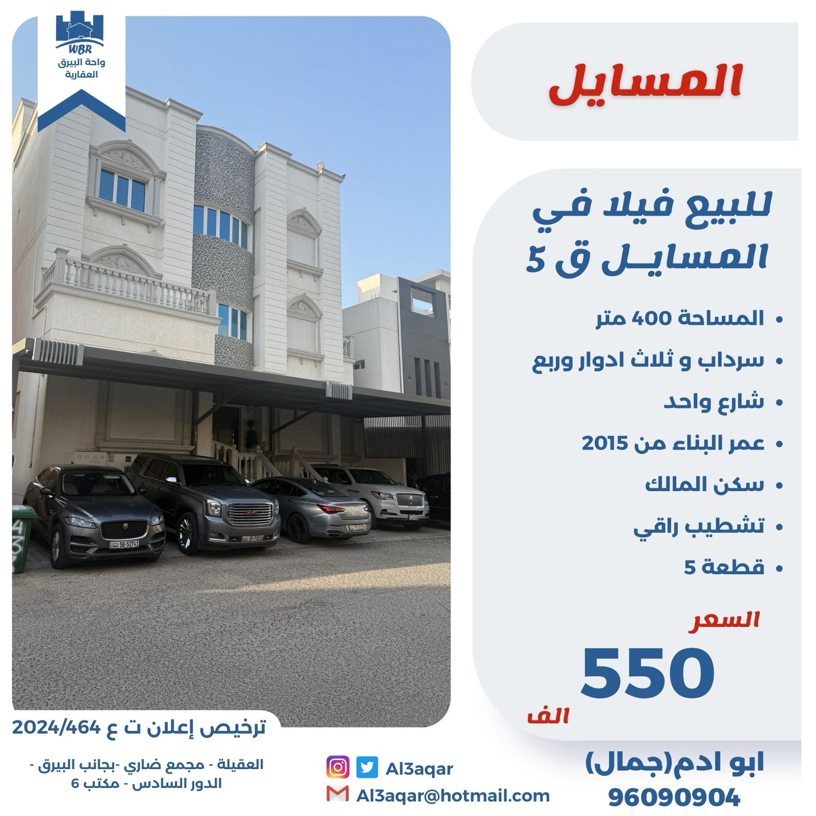 فيلا للبيع بالمسايل قطعة 5 Share ملخص للبيع فيلا فى المسايل قطعة 5 ، مساحتها 400 متر مربع ، تتكون من سرداب وثلاث أدوار وربع ، تقع على شارع واحد ، عمر البناء 2015 ، الفيلا سكن المالك والتشطيب راقي ، السعر 550 ألف د.ك . التفاصيل حالة: للبيع Page Views الأماكن القريبة من جوجل خصائص ذات صلة للبيع تجربة عنصر للبيع abdulrahman منذ أسبوعين للبيع د.ك111111 شقة تجربة عقار جديد خليل بوست أسرة: 666666 الحمامات: 666666 admin منذ 4 أسابيع Close