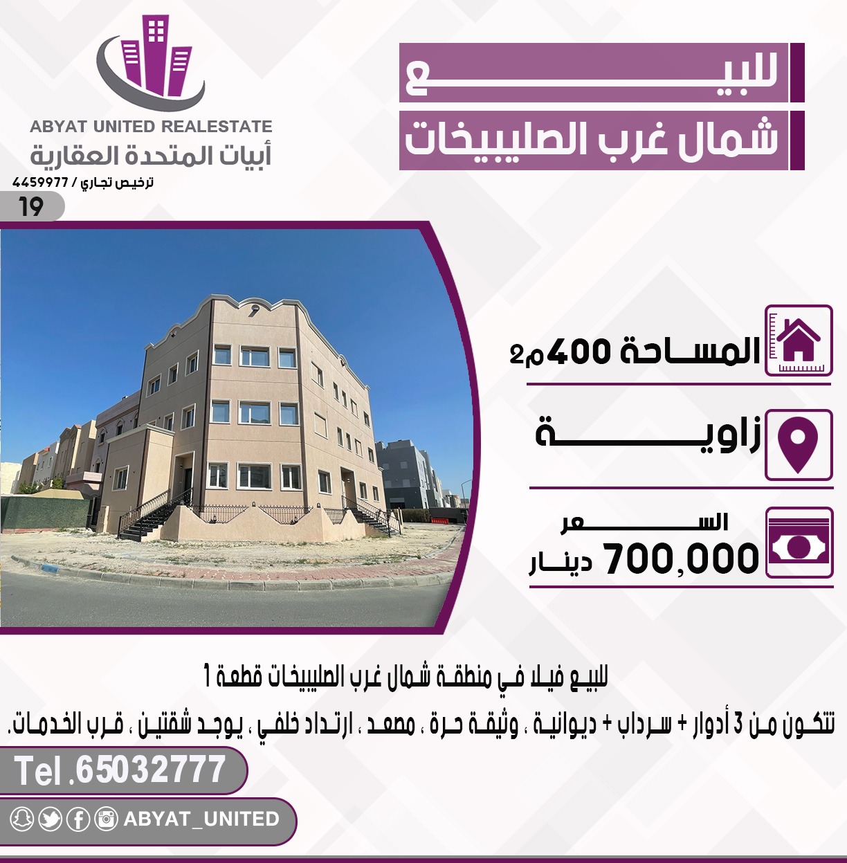 للبيع فيلا فى منطقة شمال غرب الصليبيخات قطعة1 ، تقع على زاوية ، مساحتها 400 متر مربع ، تتكون من 3 ادوار ، سرداب ، ديوانية ، وثيقة حرة ، مصعد ، ارتداد خلفى ، يوجد شقتين ، قرب الخدمات ، للاستفسار النقال1 65032777 ، السعر 700 ألف دينار كويتى .