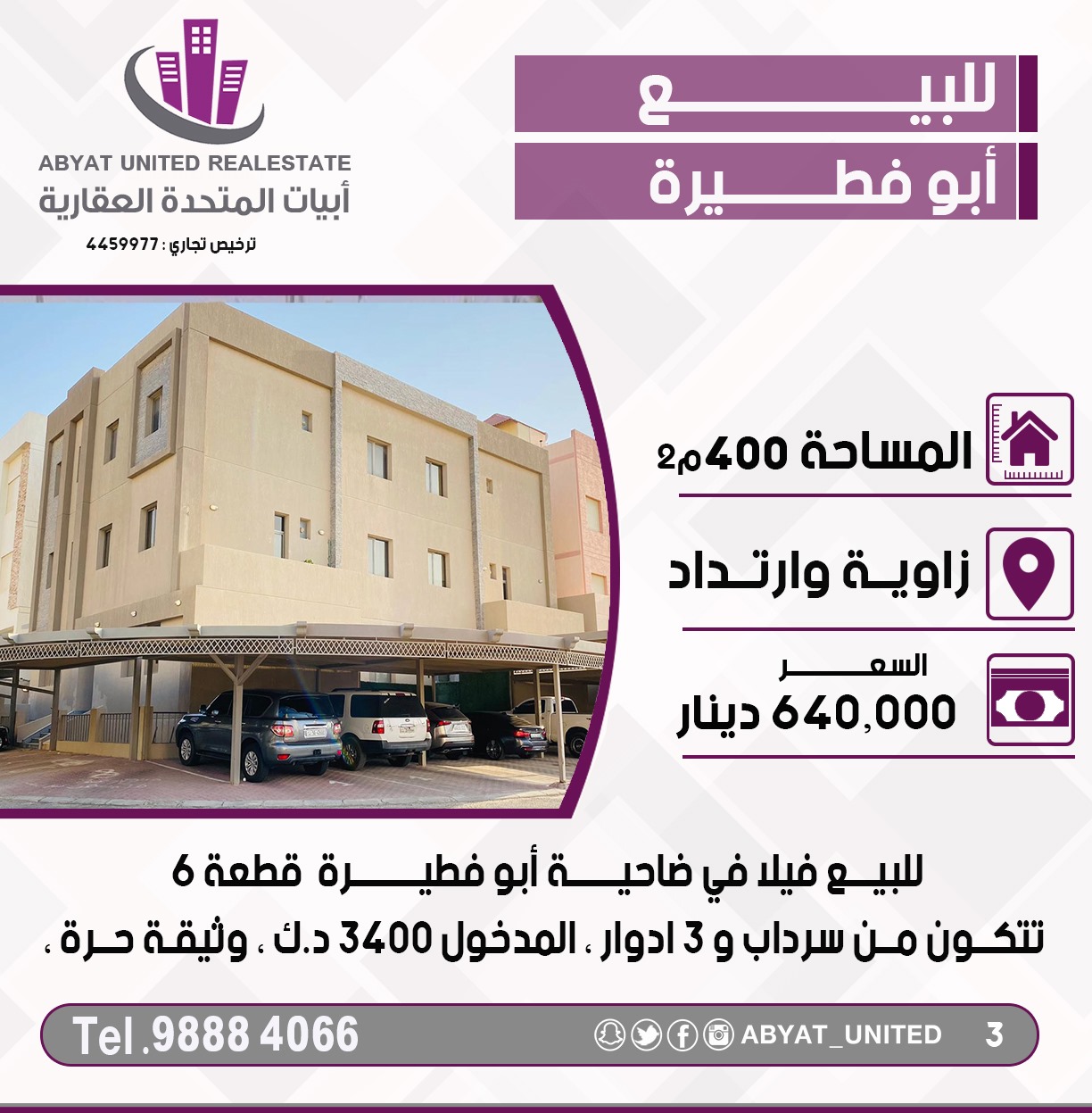 للبيع فيلا في ضاحية ابوفطيرة قطعة 6 ، مساحتها 400 متر مربع ، تقع على زاوية وارتداد ، مدخل ومخرج سهل ، قرب الخدمات ، وثيقة حرة ، تتكون من سرداب وثلاثة ادوار ، المدخول 3400 دينار كويتى ، السعر 640 ألف د.ك