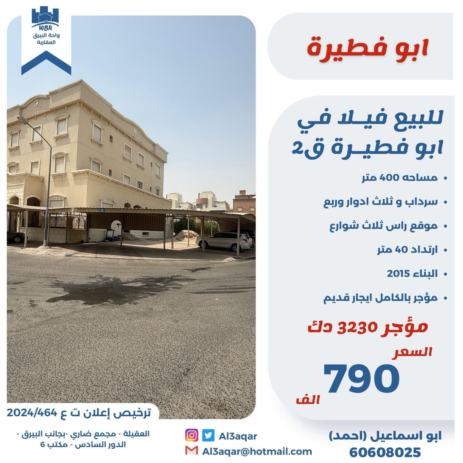 فيلا للبيع فى ابوفطيره مؤجره بالكامل Share ملخص للببع فيلا في ابو فطيرة قطعة 2 , مساحتها 400 متر مربع ، تتكون من سرداب وثلاث ادوار وربع ،موقع راس ثلاث شوارع ارتداد 40 متر البناء2015 مؤجره بالكامل , ايجار قديم مؤجر 3230 دك , السعر 790 ألف د.ك التفاصيل حالة: للبيع Page Views الأماكن القريبة من جوجل خصائص ذات صلة للبيع تجربة عنصر للبيع abdulrahman منذ 3 أسابيع للبيع د.ك111111 شقة تجربة عقار جديد خليل بوست أسرة: 666666 الحمامات: 666666 admin منذ 4 أسابيع Close