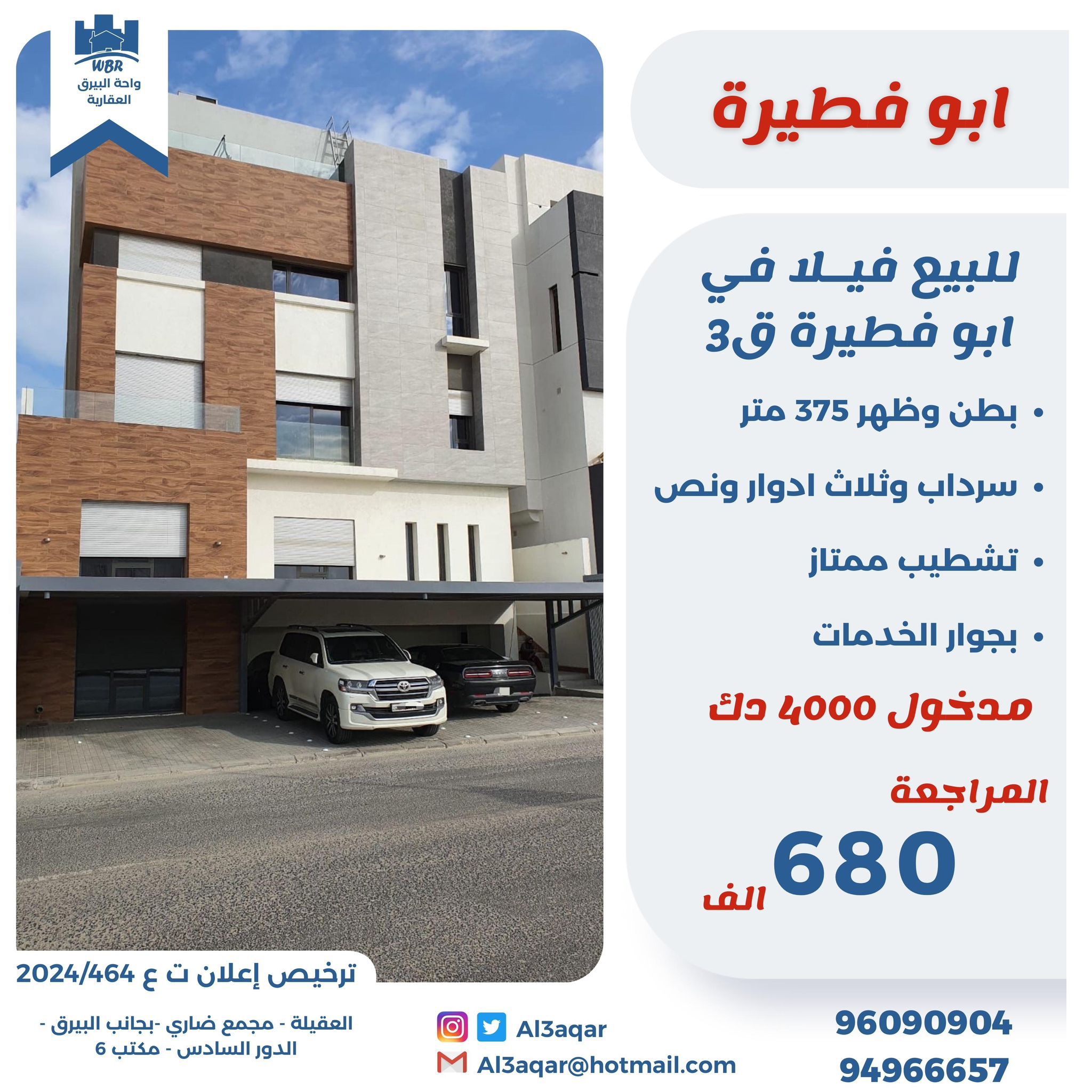 فيلا للبيع فى ابوفطيره Share ملخص للبيع فيلا فى ابو فطيره ، تقع على بطن وظهر ، مساحتها 375 متر مربع ، سرداب وثلاثة ادوار ونص ، تشطيب ممتاز ، بجوار الخدمات ، مدخول 4000 د.ك ، السعر 680 ألف د.ك . التفاصيل حالة: للبيع Page Views الأماكن القريبة من جوجل خصائص ذات صلة للبيع تجربة عنصر للبيع abdulrahman منذ 3 أسابيع للبيع د.ك111111 شقة تجربة عقار جديد خليل بوست أسرة: 666666 الحمامات: 666666 admin منذ 4 أسابيع Close
