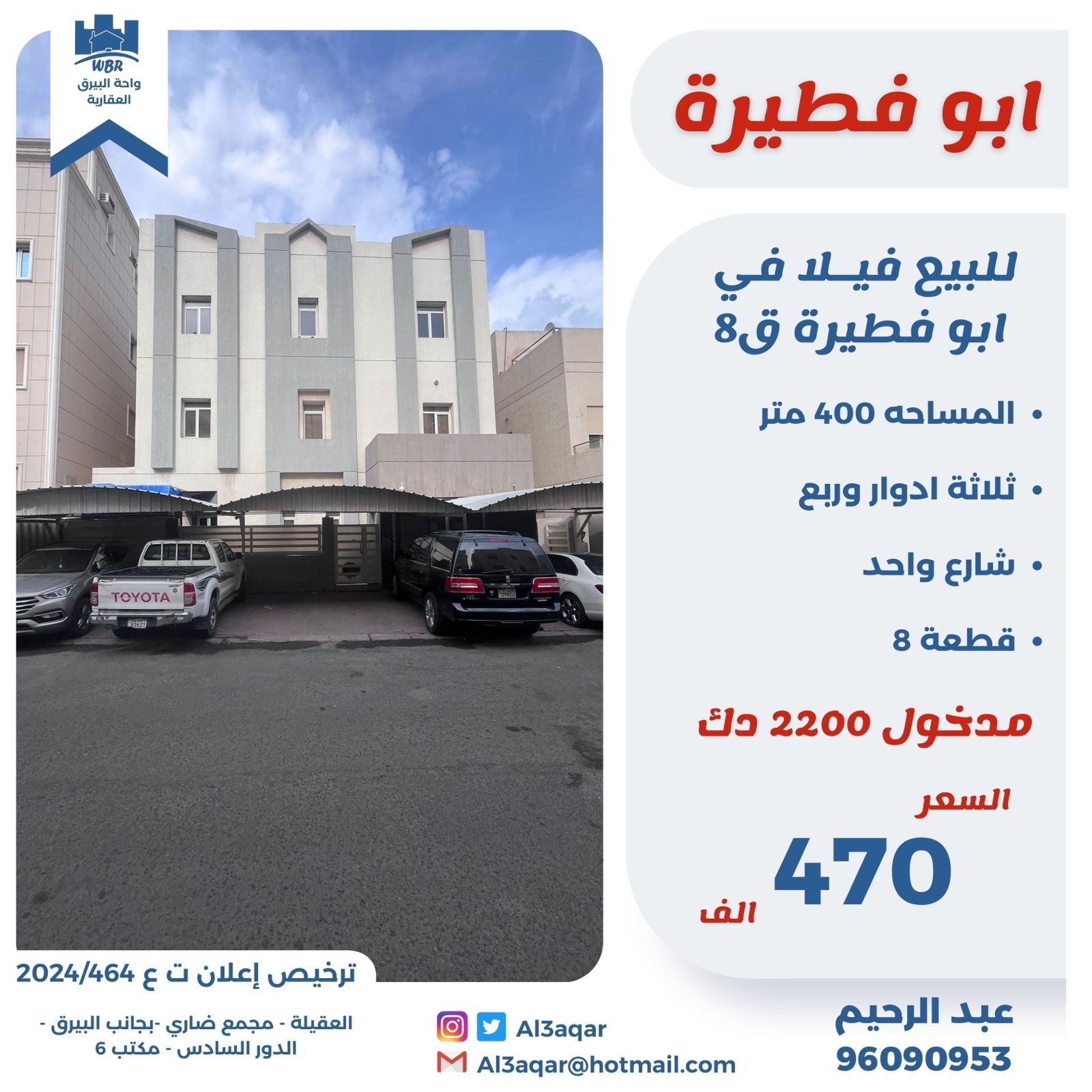 فيلا للبيع فى ابوفطيره Share ملخص للبيع فيلا فى ابو فطيره قطعه 8 ، مساحتها 400 متر مربع ، تتكون من 3 ادوار وربع ، تقع على شارع واحد ، المدخول 2200 د.ك ، السعر 470 ألف د.ك . التفاصيل Page Views الأماكن القريبة من جوجل Close
