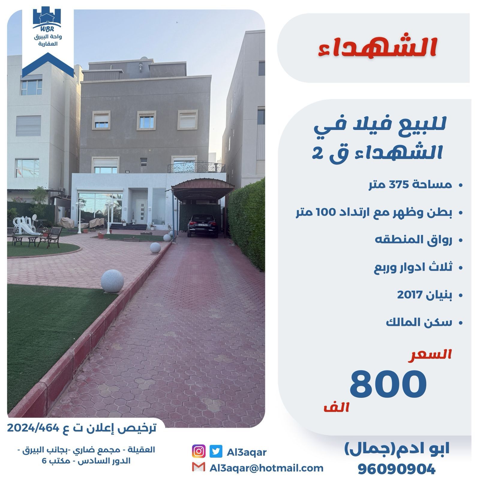 للبيع فيلا فى الشهداء ، قطعة 2 ، المساحة 375 متر مربع ، تقع على بطن وظهر ، مع ارتداد 100 متر ، رواق المنطقه ، تتكون من ثلاث ادوار وربع ، بنيان 2017 ، سكن المالك ، السعر 800 ألف د.ك