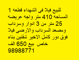 فيلا للبيع فى الشهداء قطعه 1 Share ملخص للبيع فيلا فى الشهداء قطعه 1 ، المساحه 410 متر مربع ، واجه عريضه 25 متر من 3 ادوار وسرداب ومصعد السرداب والارضى فيلا فوق دور كامل الاخير شقتين بناء خاص بيع 650 ألف د.ك 98988771 التفاصيل حالة: للبيع Page Views الأماكن القريبة من جوجل خصائص ذات صلة للبيع تجربة عنصر للبيع abdulrahman منذ أسبوعين للبيع د.ك111111 شقة تجربة عقار جديد خليل بوست أسرة: 666666 الحمامات: 666666 admin منذ 4 أسابيع Close