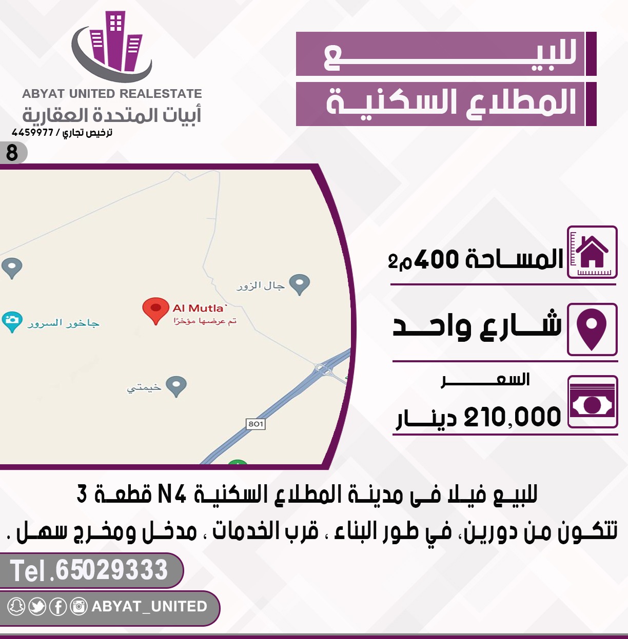 فيلا للبيع فى المطلاع السكنية Share ملخص للبيع فيلا في مدينة المطلاع السكنية N4 ، قطعة 3 ، الموقع شارع واحد ، المساحة 400 متر مربع ، تتكون من دورين، في طور البناء ، قرب الخدمات ، مدخل ومخرج سهل ، للاستفسار ، النقال 1 65029333 ، السعر 210 ألف دينار كود 8 التفاصيل Page Views الأماكن القريبة من جوجل Close