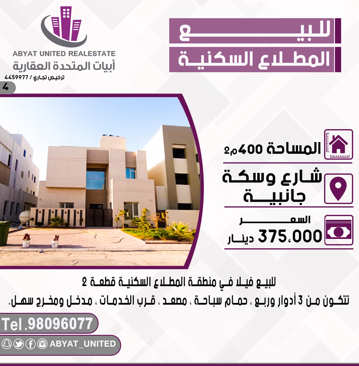 للبيع فيلا في مدينة المطلاع السكنية قطعه 2 الموقع شارع وسكه جانبيه ، المساحة 400 متر مربع ، تتكون من 3 ادوار وربع ، حمام سباحه ، مصعد ، قرب الخدمات ، مدخل ومخرج سهل .