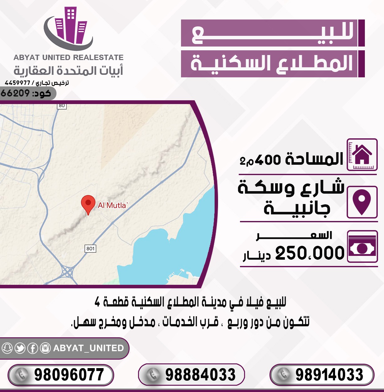 للاستفسار ، النقال 1 98096077 ، النقال 2 98884033 ، النقال3 98914033 ، السعر 250 ألف دينار ، الكود 66209