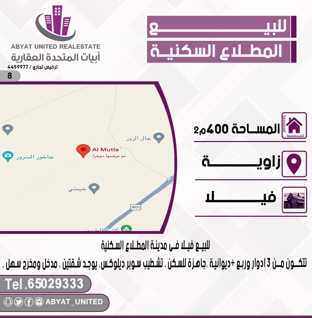 للبيع فيلا في مدينة المطلاع السكنية ، تقع على زاوية ، مساحتها 400 متر مربع ، تتكون من 3 ادوار وربع ، ديوانية ، جاهز للسكن ، تشطيب سوبر ديلوكس ، يوجد شقتين ، مدخل ومخرج سهل ، للاستفسار النقال 1 65029333