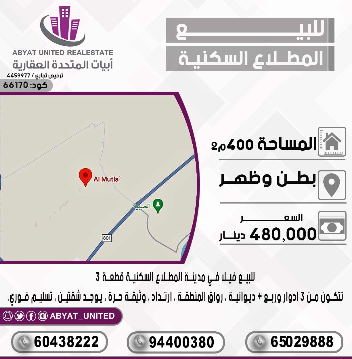للاستفسار النقال 1 60438222 ,النقال 2 94400380 ,النقال3 65029888 . السعر 480 الف دينار , الكود 66170