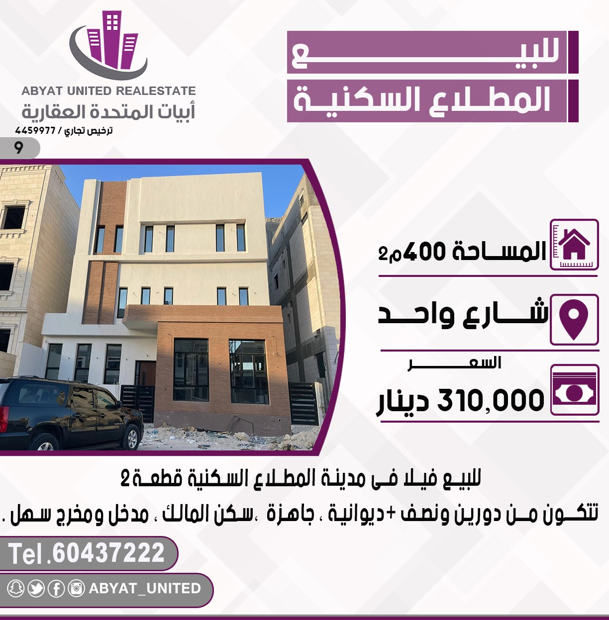 للبيع فيلا في مدينه المطلاع السكنية قطعة 2 , الموقع شارع واحد ، المساحة 400 متر مربع ، تتكون من دورين ونصف ، ديوانية ، جاهزة ، سكن المالك ، مدخل ومخرج سهل ، للاستفسار النقال 1 60437222 ، السعر 310 ألف د.ك دينار كويتى