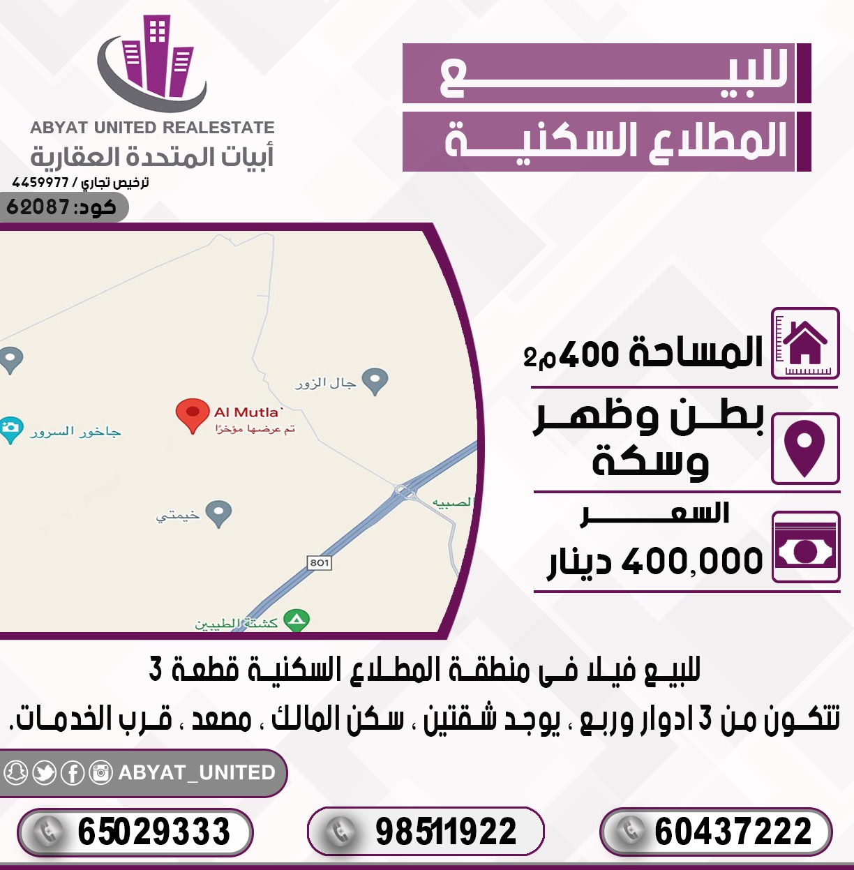 للبيع فيلا في منطقة المطلاع السكنية ، قطعة 3 ، الموقع بطن وظهر وسكة ، المساحة 400 متر مربع ، تتكون من 3 ادوار وربع ، يوجد شقتين ، سكن المالك ، مصعد ، قرب الخدمات ، للاستفسار ، النقال 1 ، 98096077 ، النقال 2 98754300 ، النقال 3 ، 98884033 ، السعر 400 ألف دينار كويتى