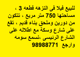 فيلا للبيع فى النزهه اطلاله مميزه Share ملخص للبيع فيلا فى النزهه قطعة 3 ، مساحتها 750 متر مربع ، تتكون من دورين وملحق بناء قديم ، تقع على شارع وسكة مع اطلاله على الشارع الرئيسى ، نسمع سومه وارجع 98988771 التفاصيل حالة: للبيع Page Views الأماكن القريبة من جوجل خصائص ذات صلة للبيع تجربة عنصر للبيع abdulrahman منذ أسبوعين للبيع د.ك111111 شقة تجربة عقار جديد خليل بوست أسرة: 666666 الحمامات: 666666 admin منذ 4 أسابيع Close