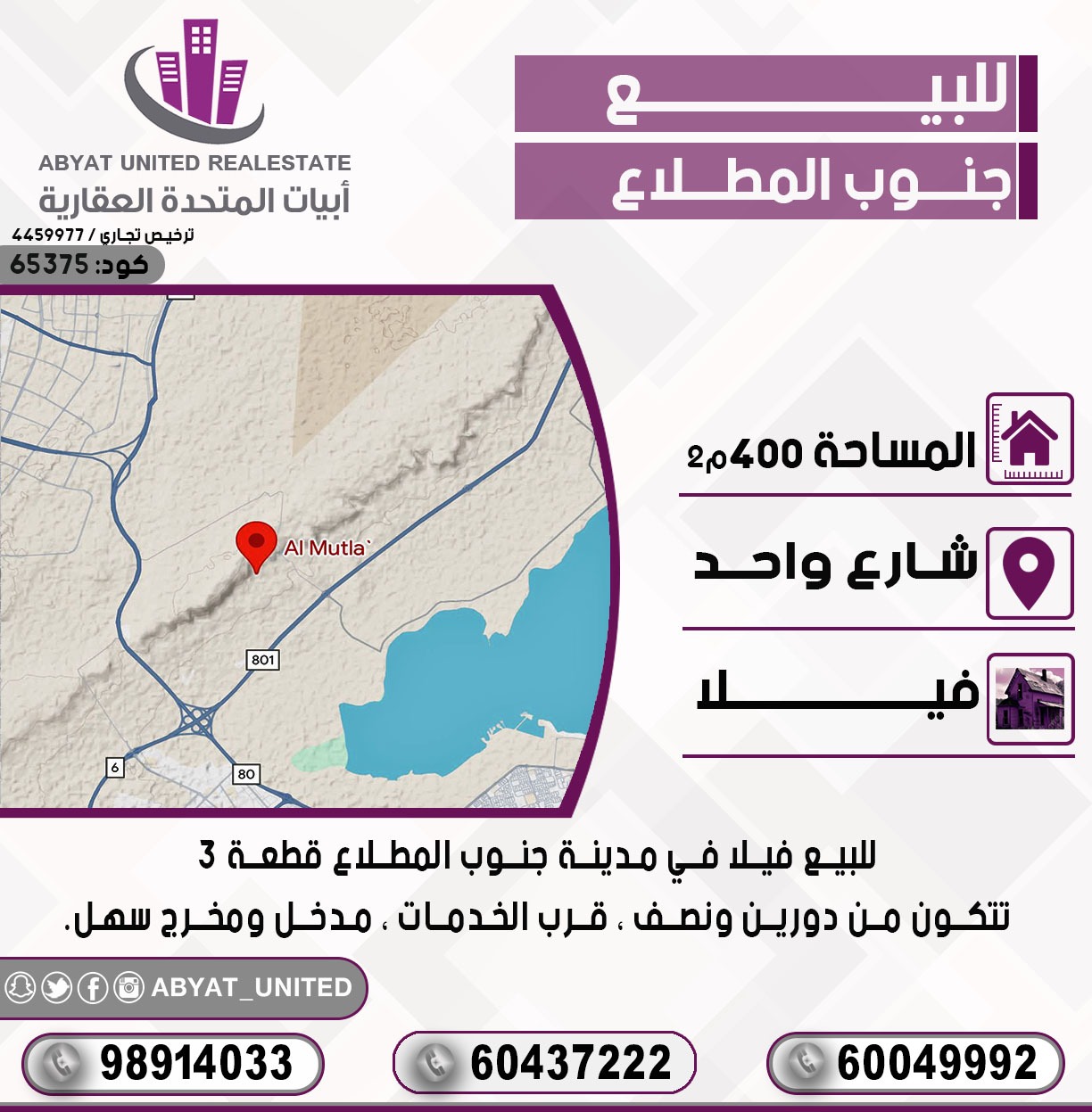 للبيع فيلا في مدينة جنوب المطلاع قطعة 3 ، الموقع شارع واحد ، المساحة 400 متر مربع ، تتكون من دورين ونصف ، قرب الخدمات ، مدخل ومخرج سهل ، للاستفسار النقال 1 98914033 ، النقال 2 60437222 ، النقال 3 60049992