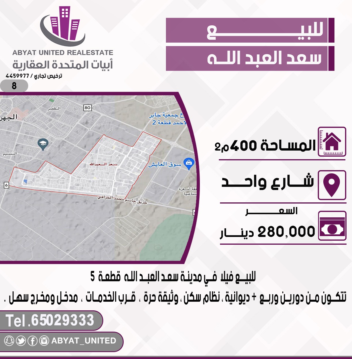 للبيع فيلا في مدينة سعد العبدالله قطعة 5 ، الموقع شارع واحد ، المساحة 400 متر مربع ، تتكون من دورين وربع ، ديوانية ، نظام سكن ، وثيقة حرة ، قرب الخدمات ، مدخل ومخرج سهل . للاستفسار النقال 1 65029333 ، السعر 280 ألف دينار